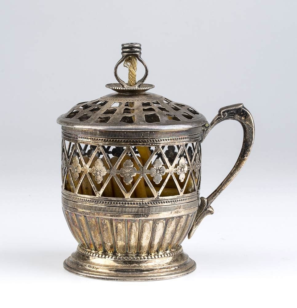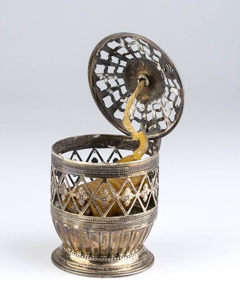 di forma circolare, realizzata a traforo con motivi geometrici e floreali, coperchio incernierato e manico ad ansa rialzata. L'avvolgicera centrale sostiene i resti di una bobina di cera. Punzonata con i marchi camerali in uso a Roma dopo il 1815 per l'argento al titolo al titolo di 10 once e 16 denari (889/1000) e con il marchio dell'argentiere GZ.