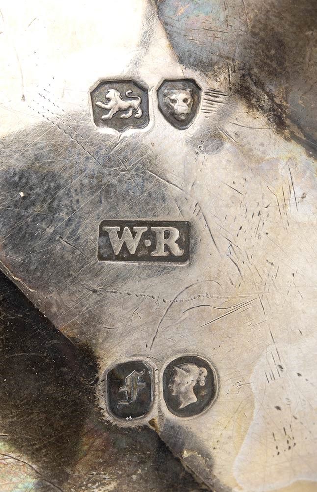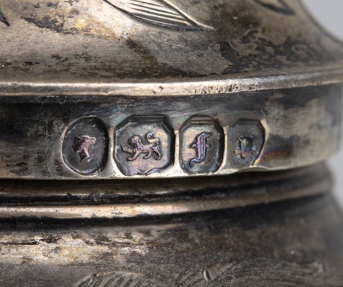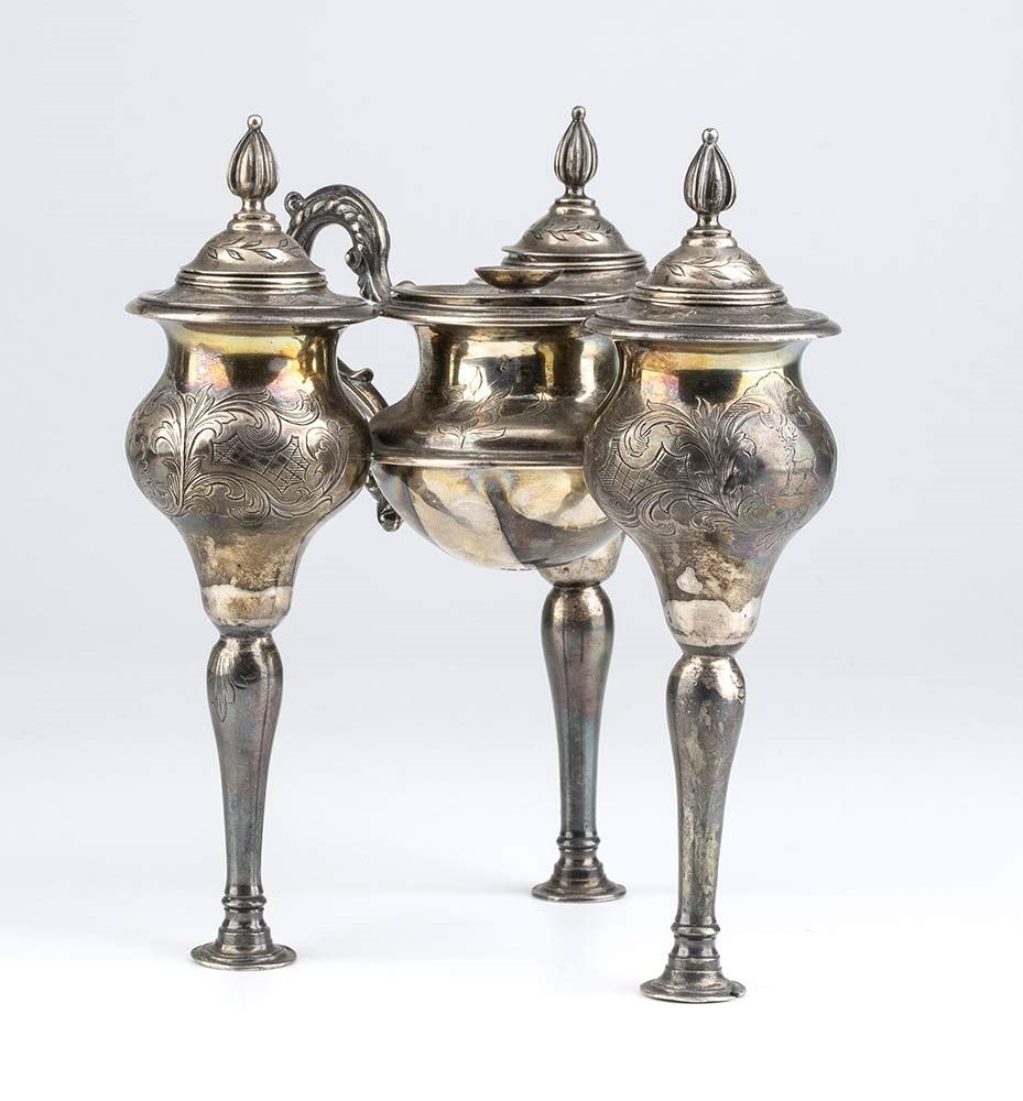 composta da tre contenitori laterali e uno centrale per lo stoppino, manico radiale. Argento 925/1000, serie completa di marchi Londra 1841-1842, maestro argentiere William Richards.