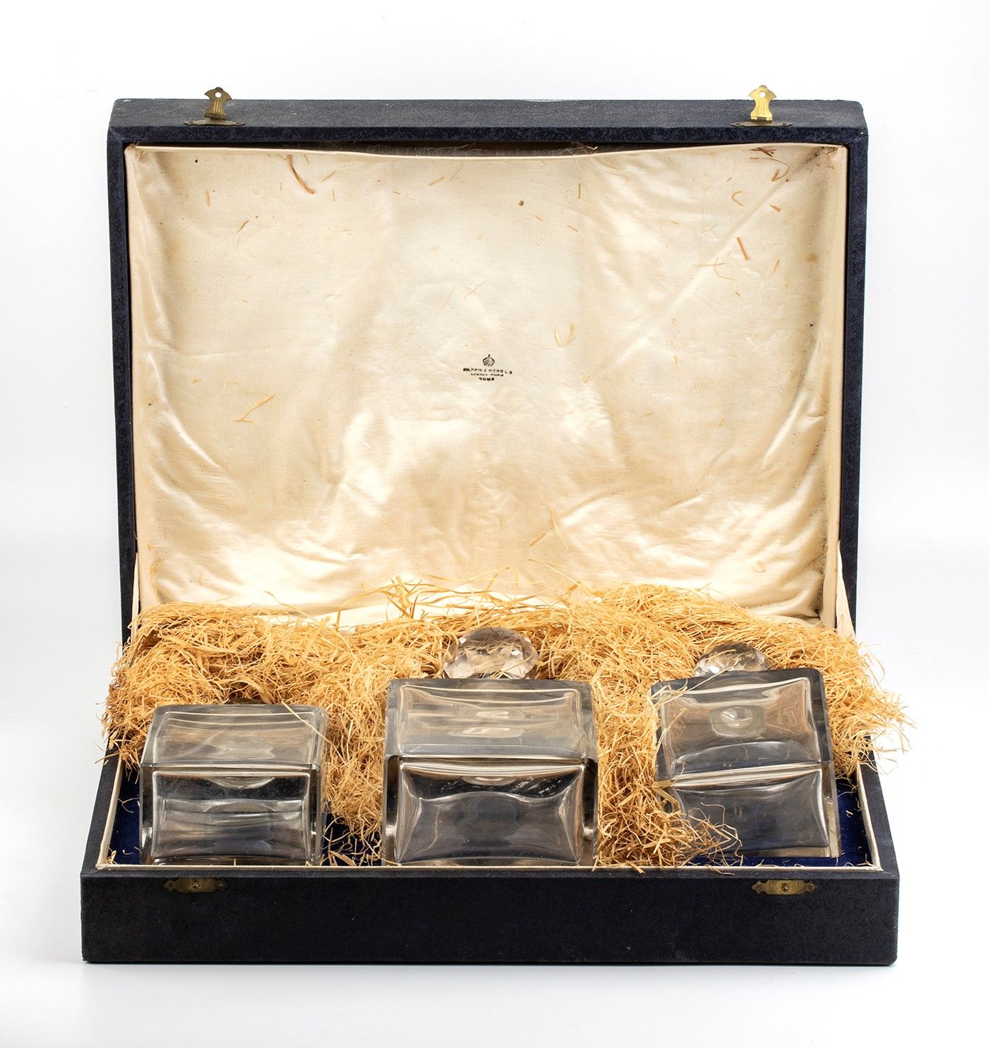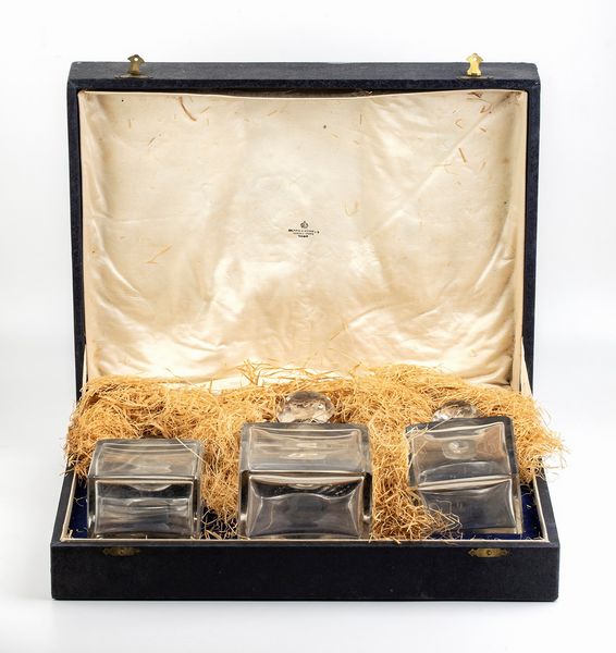 di forma rettangolare, con custodia originale. Argento 925/1000, serie completa di marchi Birmingham 1923-1924, argentieri Mappin & Webb Ltd. Altezza x larghezza x profondità : 25,5 x 11 x 7 cm. Altezza x larghezza x profondità : 20 x 9 x 5 cm. Peso totale bottiglie 2698 gr, custodia 1745 gr. Stato di conservazione: **** buono.