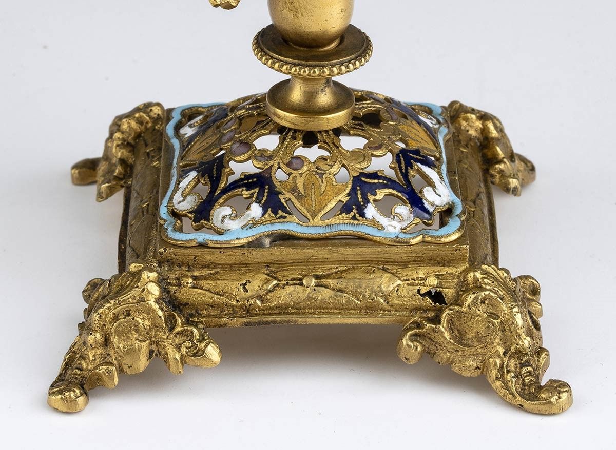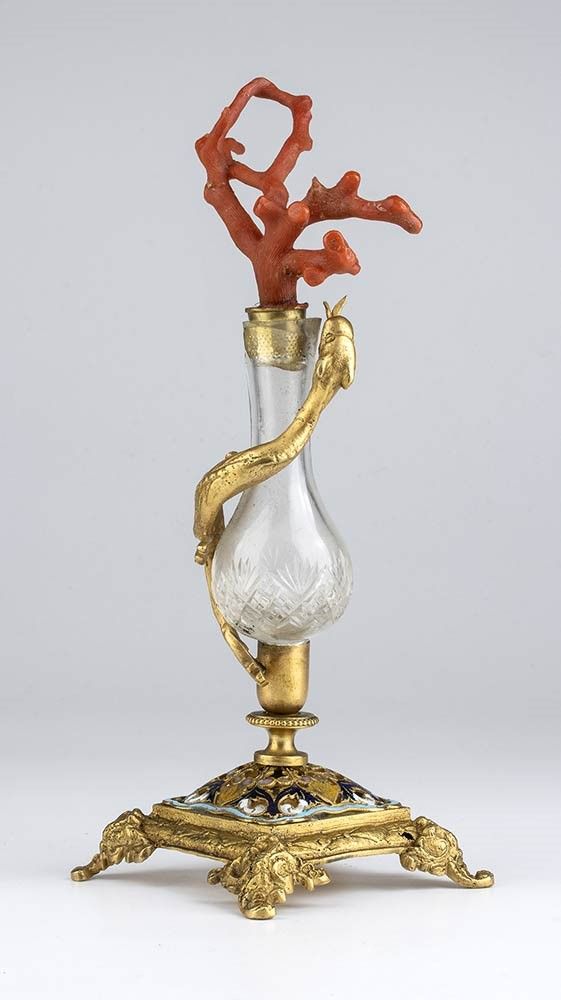 in bronzo dorato, base quadrata traforata e decorata con smalti policromi poggiante su quattro piedini fogliati sulla quale si innesta il contenitore in vetro molato sul quale è avviluppato un serpente; sulla sommità un ramo di corallo mediterraneo (corallium rubrum).