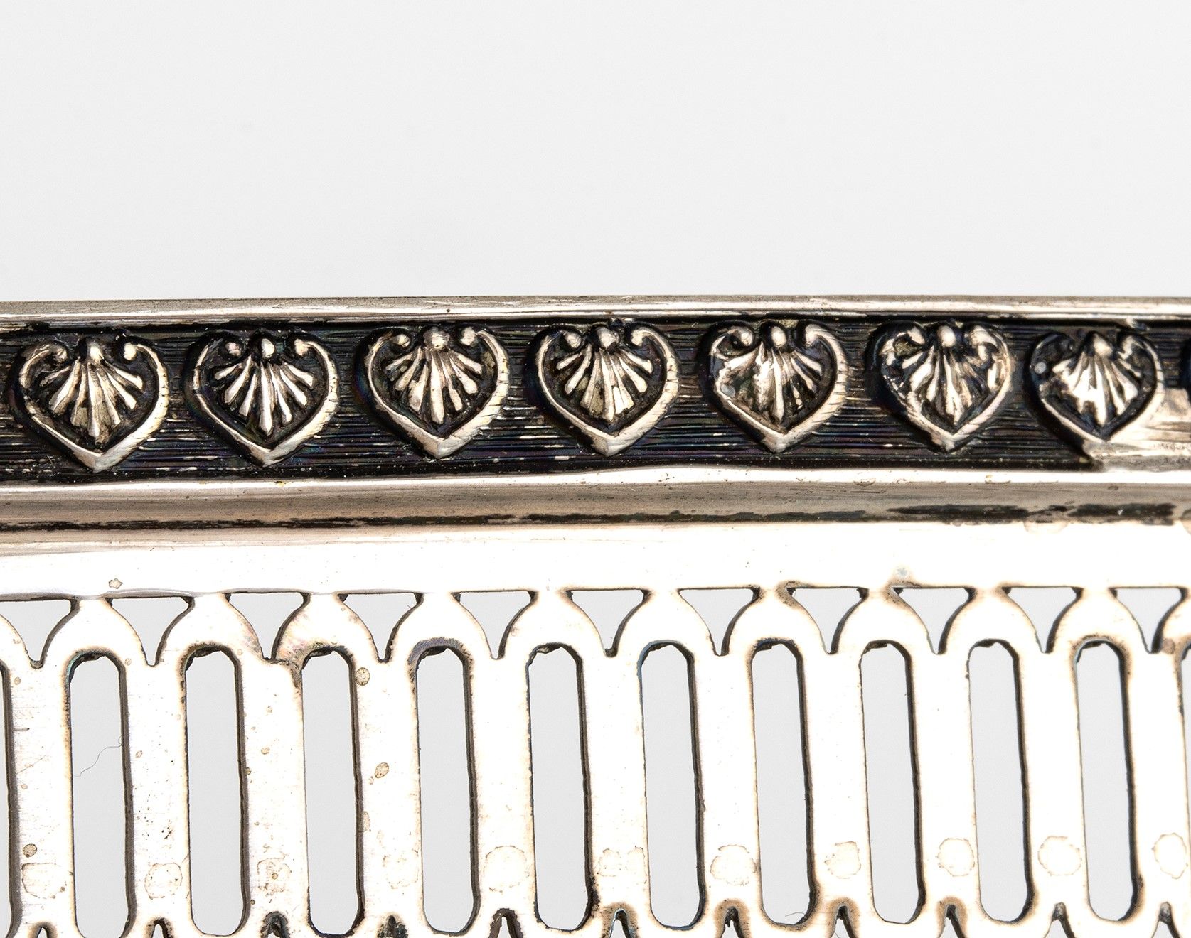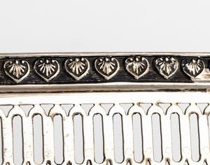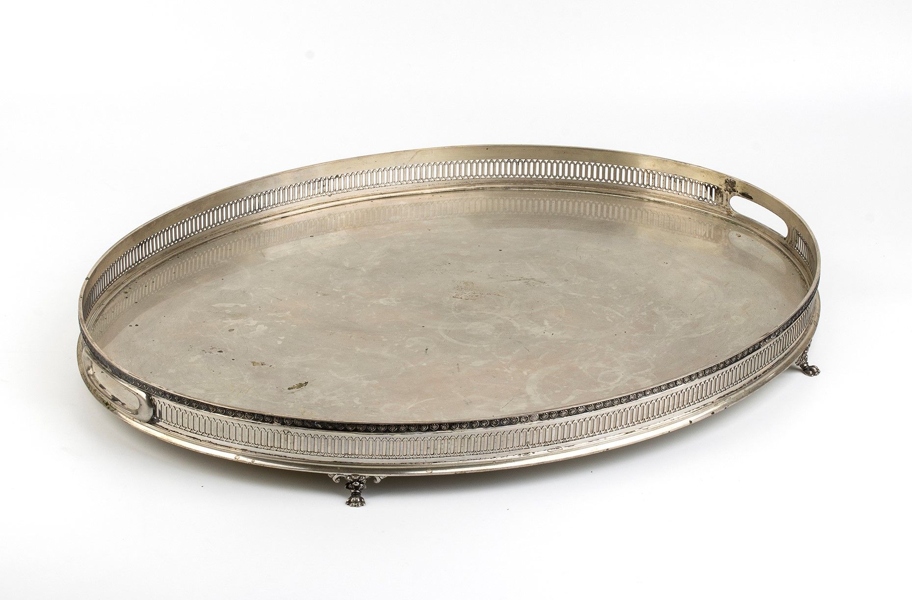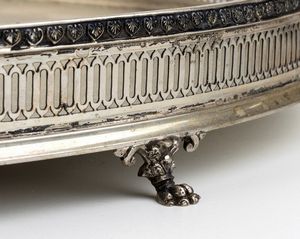 di foma ovale con ringhierina poggiante su piedi ferini. Argento 800/1000, punzonato 800 e 176 FI argentiere Pampaloni Ermindo. Altezza x larghezza x profondità : 4,5 x 46 x 36 cm, peso 1690 gr. Stato di conservazione: **** buono.