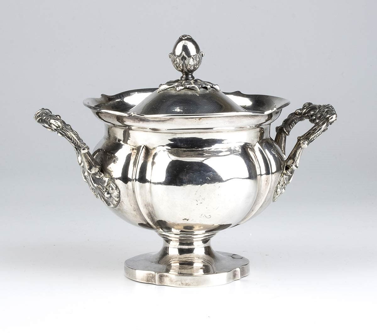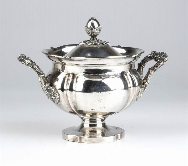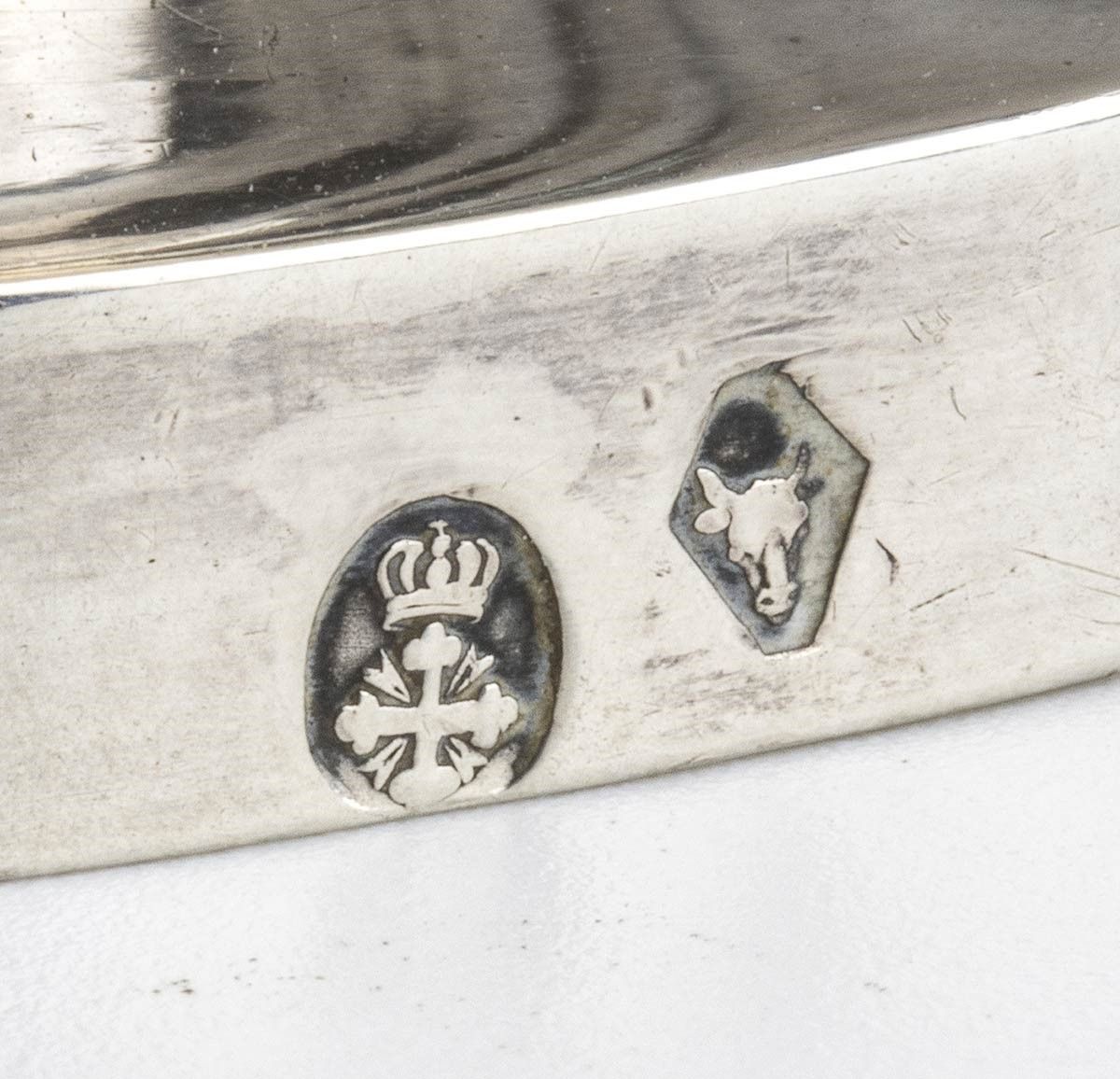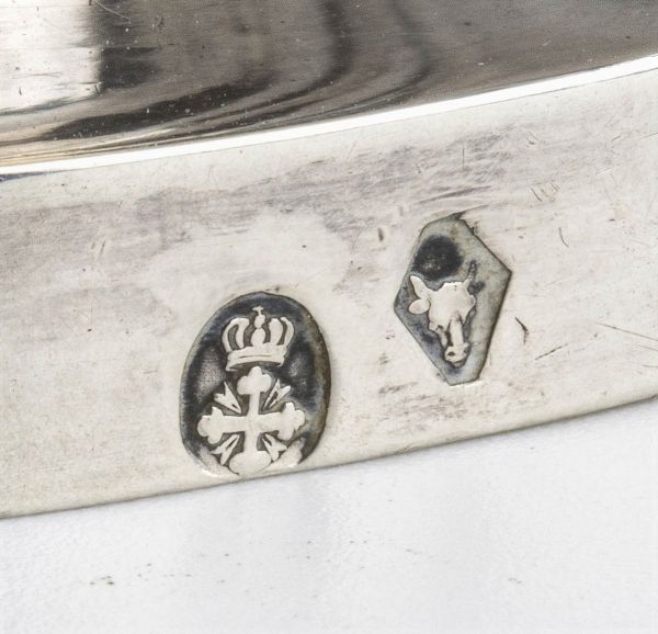 di forma sagomata, con manici laterali. Argento 800/1000, punzonata con i marchi in uso a Tornno, Regno di Sardegna dal 1824 al 1872.