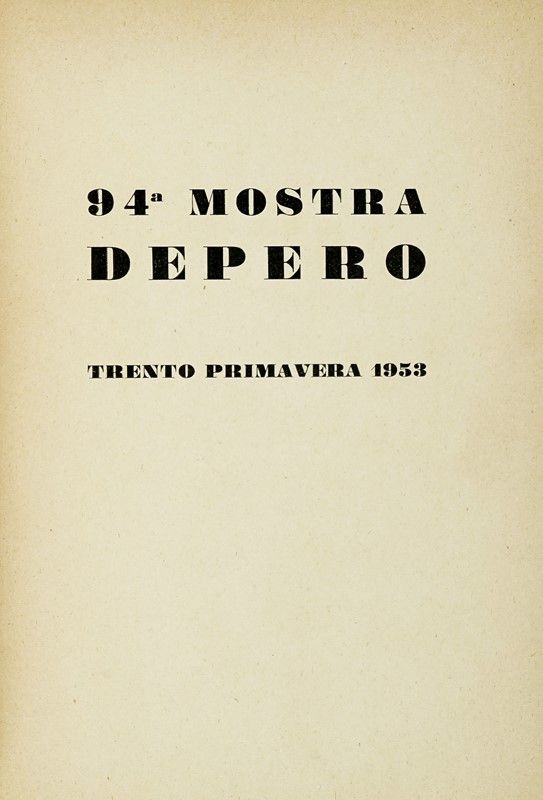In-8° (mm 233x167). Pagine 39, [1] + 32 pagine con le riproduzioni delle opere di Fortunato Depero. Brossura originale con composizione grafica del nome dell'Artista al piatto anteriore e un'illustrazione a quello posteriore. Design e impaginazione ad opera di Depero. Uno strappetto alla cuffia superiore, altrimenti ottima copia.