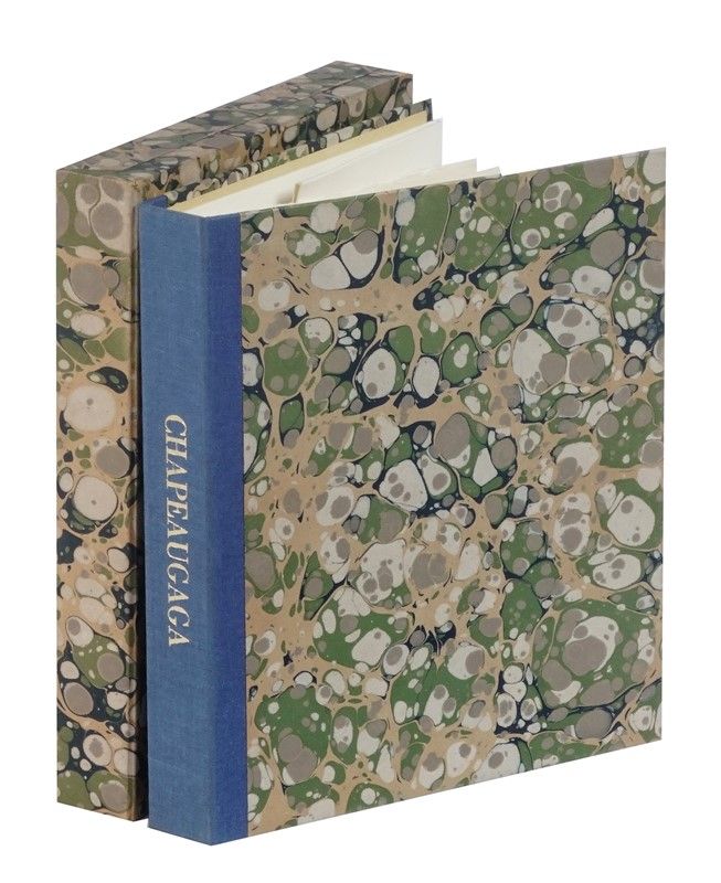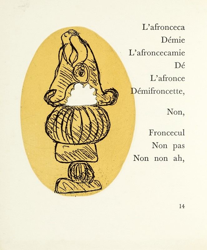 In-16° (mm 170x140). Pagine 40, con 15 bellissime incisioni di Enrico Baj nel testo. di cui 8 a piena pagina e una a doppia pagina con inserti a collage. Minime fioriture. Brossura originale con camicia editoriale in mezza tela con titolo in oro al dorso e piatti marmorizzati; il tutto conservato in astuccio cartonato marmorizzato, contiene una brossura bianca muta in 10 bifoli sciolti in carta forte Ventura. Uno dei 35 esemplari, che costituiscono l'edizione originale, contenenti la suite aggiuntiva di acqueforti di Enrico Baj (qui assente) su una tiratura complessiva di 100 copie numerate e firmate al colophon dall'Autore e dall'Artista.