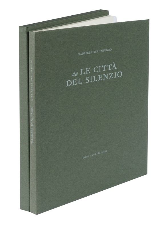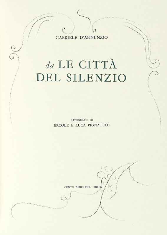 In-folio (mm 350x260). Pagine 72, [4] con 12 belle litografie a piena pagina di Ercole e Luca Pignatelli nel testo. Brossura editoriale verde con titoli al piatto anteriore e al dorso, conservata in custodia in cartone. Ottima copia. Uno dei 100 esemplari ad personam su una tiratura complessiva di 130, firmati a matita dagli Artisti al colophon.