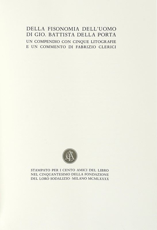 In-4° (mm 345x255). Pagine 47, [4] con 5 litografie originali di Fabrizio Clerici, firmate a matita. Brossura editoriale in carta blu con titoli impressi in oro al dorso, lievemente ondulata; sovraccoperta in plastica trasparente e custodia in cartone rivestita in carta decorata a mano. Uno dei 100 esemplari ad personam, su una tiratura complessiva di 150 copie.