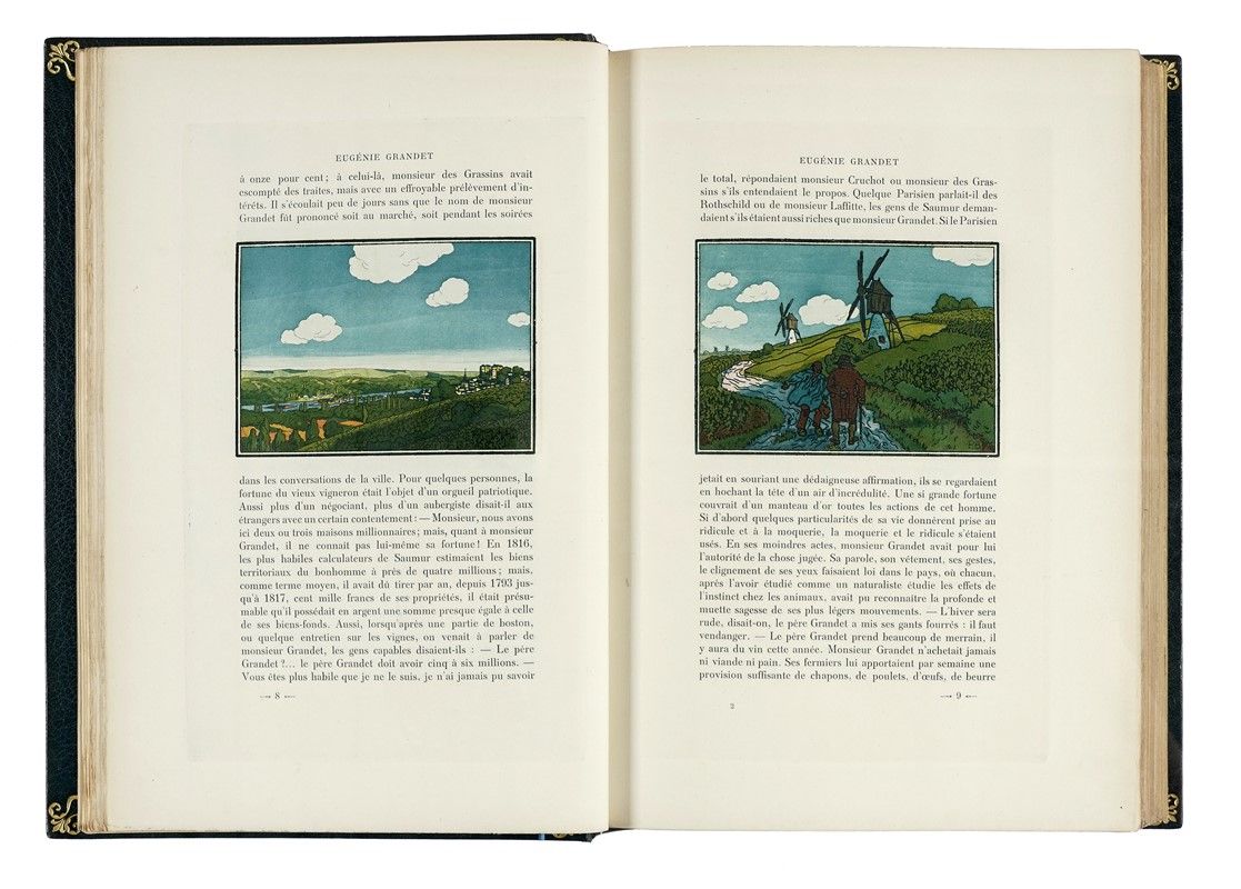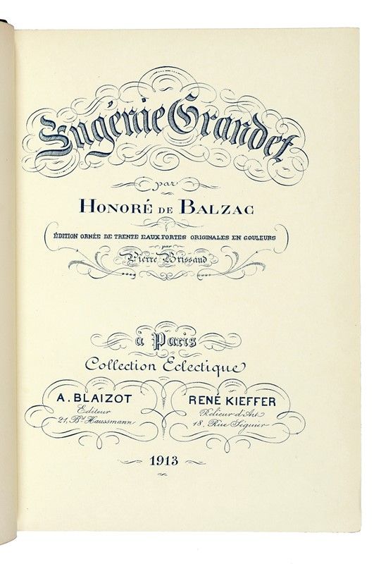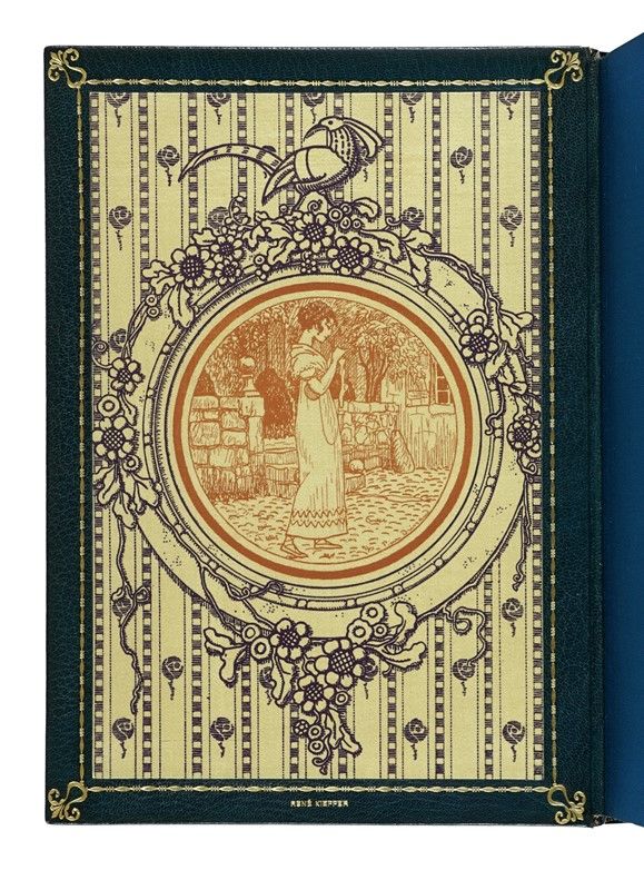 In-4° (mm 295x205). Pagine [10], 182, [6] con 30 illustrazioni a colori, a piena pagina e nel testo, e una suite finale di 60 incisioni (ciascuna incisione è presente in suite in due stati). Copia perfetta. Es. n. 49 su una tiratura complessiva di 250 copie, uno degli esemplari con le tavole in tre stati. Bellissima legatura René Kieffer in pieno marocchino blu con fregi impressi in oro a dorso e piatti, illustrazioni su seta applicate ai contropiatti, sguardie in seta e carta decorata, tagli dorati. Leggera scoloritura del dorso, per il resto ottimo stato complessivo.