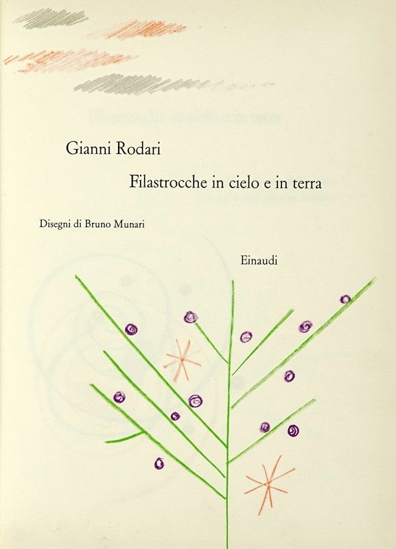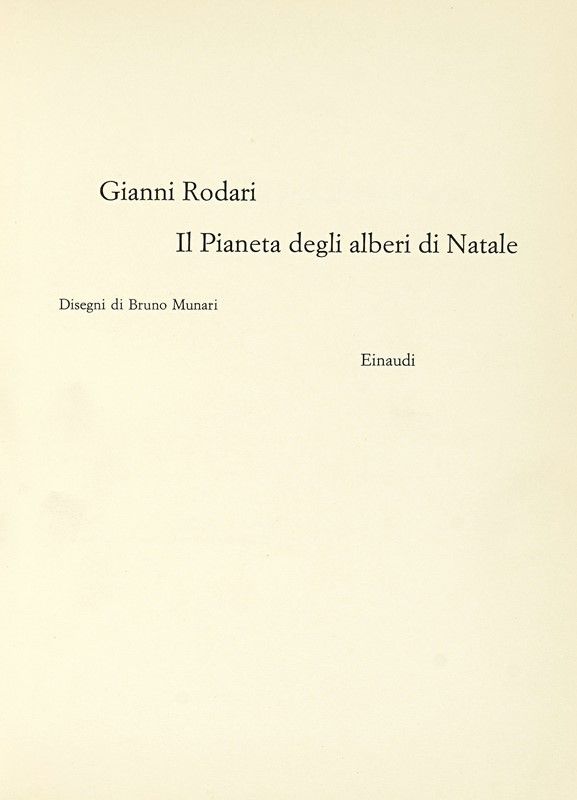 In-8° (mm 233X167). Pagine 154, [2]. Illustrato con i disegni a colori nel testo di Bruno Munari. Ottima conservazione. Legatura editoriale in cartone illustrato dall'Artista, con titoli in nero al piatto e al dorso. Tracce d'uso. SI AGGIUNGE: Id., Il pianeta degli alberi di Natale. Disegni di Bruno Munari. Torino: Giulio Einaudi, 1962. In-8° (mm 237X166). Numerose illustrazioni, a colori e in bianco e nero, anche a piena pagina nel testo, di Bruno Munari. Ottima conservazione. Legatura editoriale in cartone illustrato dall'Artista, con titoli in nero al piatto e al dorso. Tracce di polvere e minimi difetti ai piatti.