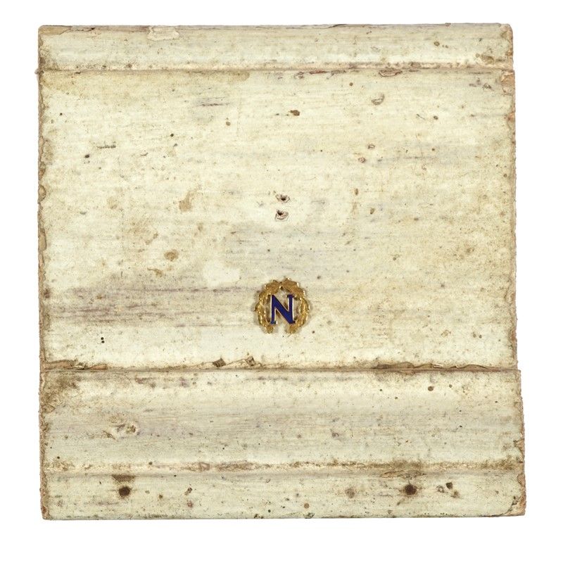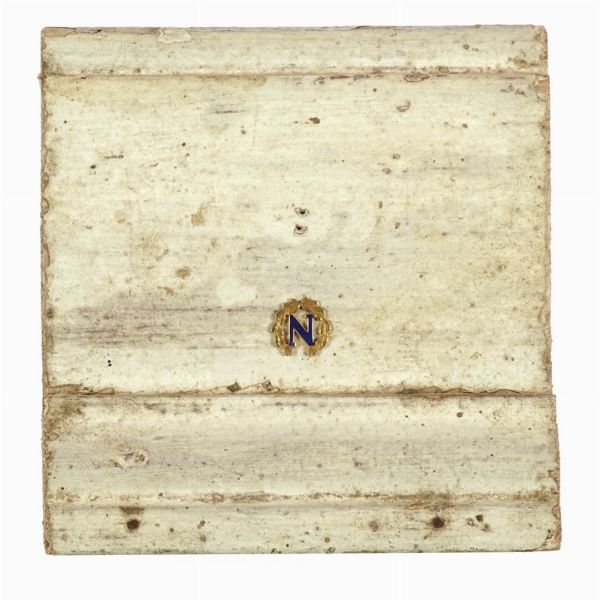 Elemento ligneo ritagliato dal rivestimento interno originale della Longwood House. Conserva l’antica pittura originale opaca color beige chiaro sul lato visibile, mentre retro e tagli sono in legno grezzo. Al centro, piccola decorazione napoleonica metallica smaltata e dorata (non coeva). Sul retro è applicata l’autentica con firma autografa del console di Francia. Dimensioni: 125x130 mm. L'elemento ligneo è conservato all'interno di un cofanetto rosso con vetro. Dimensioni: 400x400 mm ca.