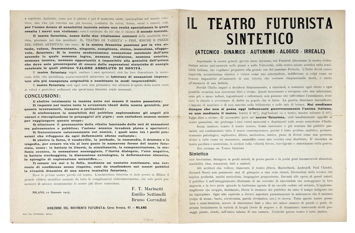 «Noi creiamo un Teatro futurista Sintetico cioè brevissimo. Stringere in pochi minuti, in poche parole e in pochi gesti innumerevoli situazioni, sensibilità, idee, sensazioni, fatti e simboli.», Milano: Direzione del movimento futurista, 11 gennaio 1915.