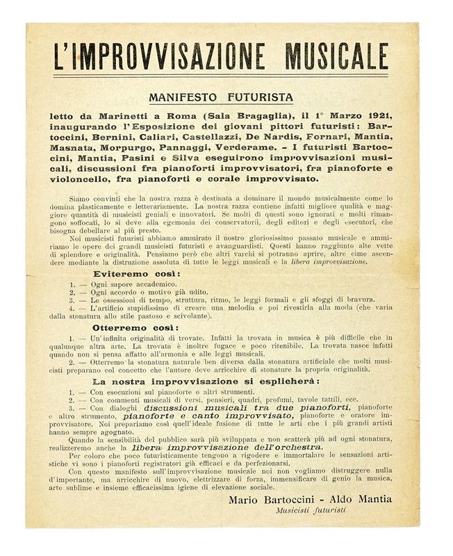 «[...] altri varchi si potranno aprire [...] mediante la distruzione assoluta di tutte le leggi musicali e la libera improvvisazione [...]. Noi prepariamo così quell'ideale fusione di tutte le arti che i più grandi artisti hanno sempre agognato», Milano: Direzione del Movimento Futurista, s.d. [i.e. 1921].