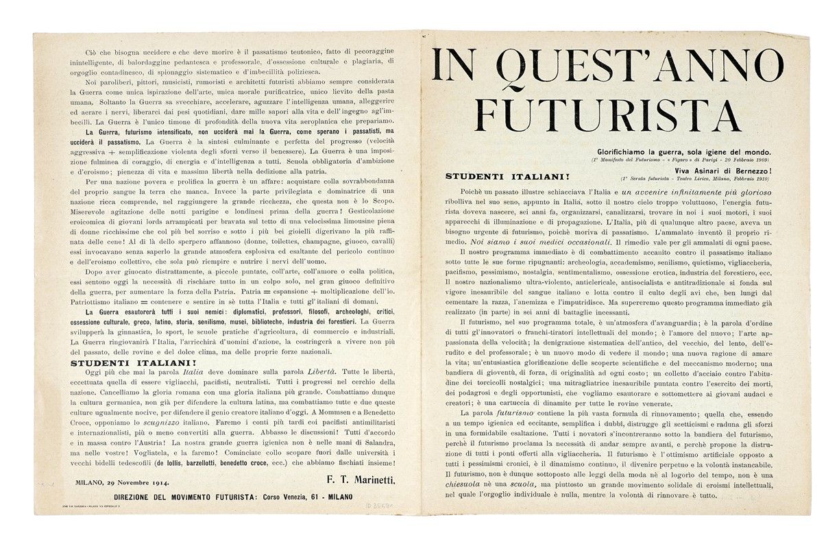 «Il nostro programma immediato è di combattimento accanito contro il passatismo italiano sotto tutte le sue forme ripugnanti...», Milano: Direzione del Movimento Futurista, 29 novembre 1914.