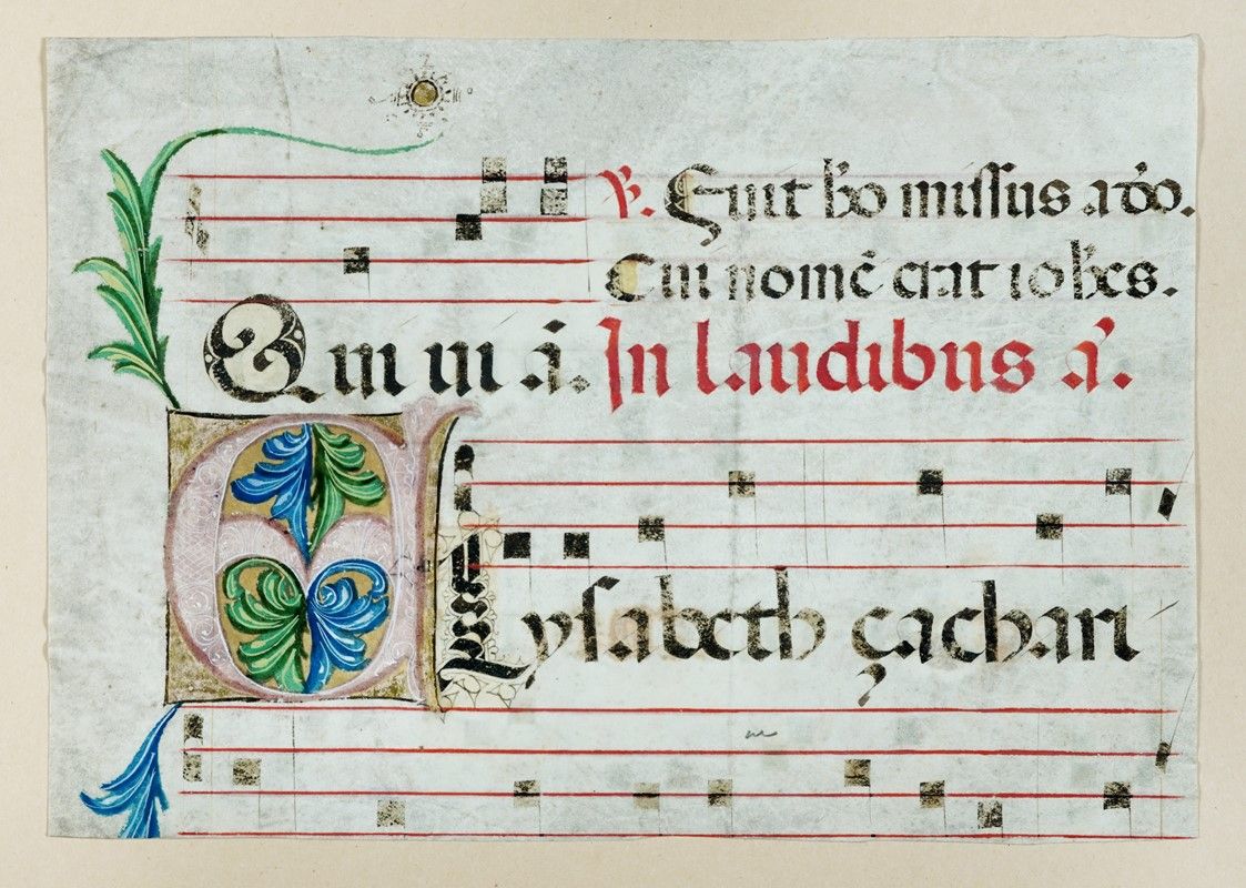 Parziale foglio di antifonario pergamenaceo (mm 212x300) con iniziale E (Elisabeth zachari) miniata. Rubr. In laudibus a[ntiphona]. Tempera (blu, verde, rosa e bianco) e oro su pergamena. Scrittura gotica con notazione musicale quadrata su tetragramma. Fregi foliati e un piccolo sole che si sviluppano dall’iniziale al margine esterno e superiore dello specchio di scrittura. Foglio applicato, per pochi centimetri, con scotch di carta a supporto cartaceo moderno (mm 320x410).