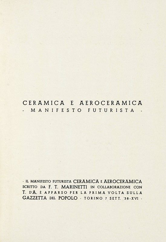 In-8° (mm 173x125). Con 1 ritratto fotografico di Marinetti e Giuseppe Mazzotti e 12 riproduzioni in bianco e nero nel testo di opere di Mario Anselmo, Tullio D'Albisola, Nicolaj Diulgheroff, Farfa, Fillia, Lucio Fontana, Alfredo "Alf" Gaudenzi ed altri. Brossura editoriale con titoli in nero al piatto. Sovraccoperta in carta marmorizzata e cofanetto coordinato in mezza pelle con piatti e punte. Ottima copia.