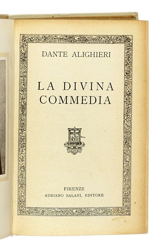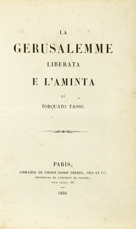 In-8° (mm 155x105). Legatura coeva in piena percallina bianca con titoli impressi in oro al dorso e al piatto anteriore. Sguardie in carta decorata. SI AGGIUNGE: Id., La Divina Commedia testo critico della società Dantesca italiana [...] rifatto da Giuseppe Vandelli. Milano: Ulrico Hoepli, 1938. In-8° (mm 185x112). SI AGGIUNGE: Tasso Torquato, La Gerusalemme liberata e l'Aminta. Paris: librairie de Firmin Didot frères, 1858.