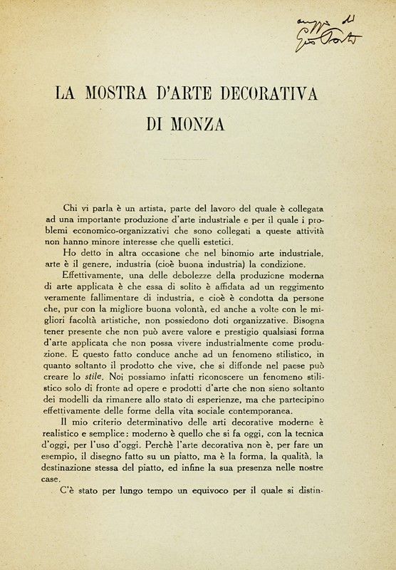 In-8° (mm 240x170). Pagine 8. Brossura editoriale con titoli in nero al piatto. Parziali bruniture ai piatti, altrimenti ottima copia. Dedica autografa manoscritta di Gio Ponti alla prima pagina.