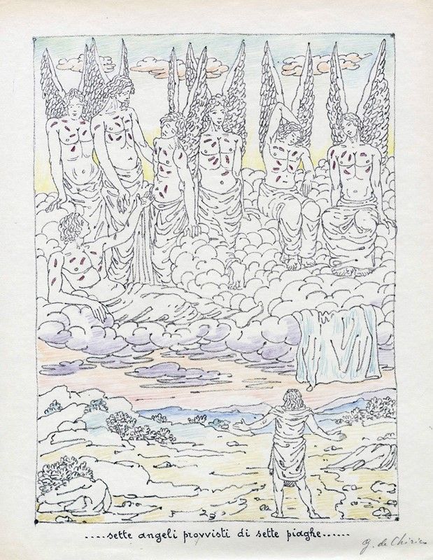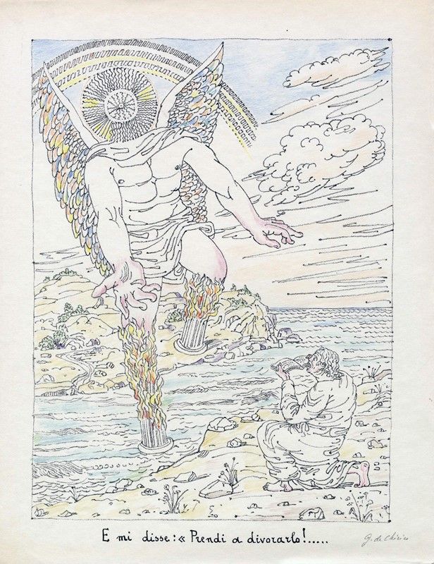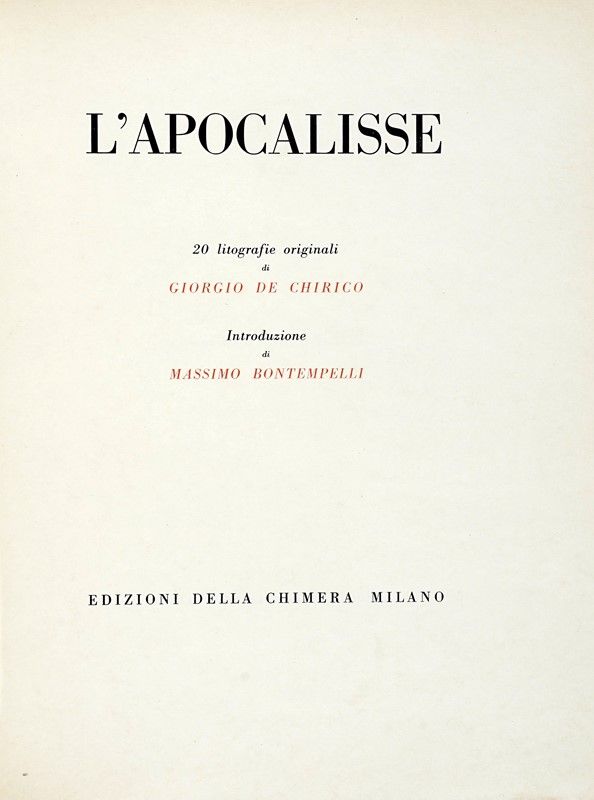 In-folio (mm 347x262). Pagine XVI, 142, [6] con 20 litografie originali sciolte di Giorgio de Chirico, tirate a mano da Piero Fornasetti e firmate a matita in basso a destra dall'Artista, dieci delle quali colorate a mano a pastello, tutte con velina protettiva. Pieghe alle veline e lievi bruniture della carta, altrimenti ottimo esemplare a bifoli sciolti. Con, sciolta, una suite aggiuntiva con 20 litografie di De Chirico in bianco e nero, firmate a matita e protette da veline; quest'ultime presentano alcuni difetti. Brossura editoriale protetta da velina, illustrata da De Chirico, conservata in chemise in cartone, un po' rovinata alle cerniere; custodia editoriale in cartonato con mancanze e difetti. Uno dei 150 esemplari numerati, su carta Giappone, su una tiratura complessiva di 160 copie. Dedica manoscritta di Massimo Bontempelli ad Arcangelo Vespignani, datata Venezia, 21/VI/43, a pagina XVI.