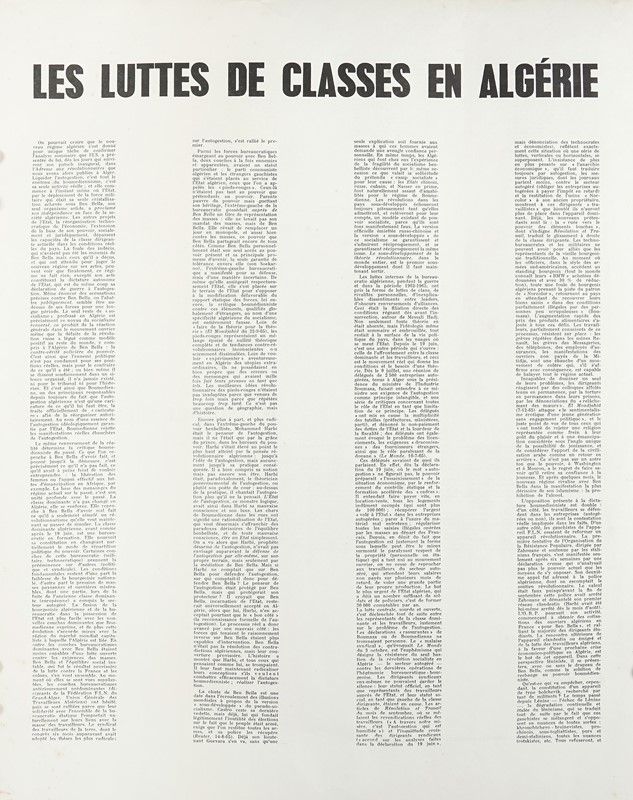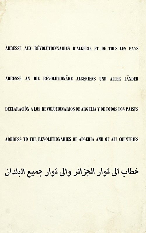 Manifesto stampato recto-verso (mm 553x447). Esemplare arrotolato, con qualche lieve fioritura e uno strappetto al margine inferiore sinistro. SI AGGIUNGE: Internationale situationniste, Adresse aux révolutionnaires d'Algérie et de tous les pays. Paris: s.e., novembre 1965. In-8° (mm 218x140). Carte [14]. Brossura originale con il titolo, riproposto in cinque lingue, al piatto anteriore. Gora marginale ai piatti, altrimenti buona conservazione.