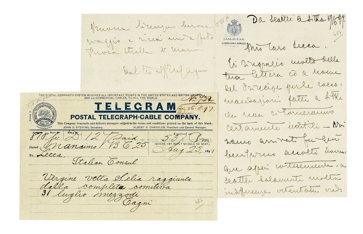 Manoscritti a inchiostro nero. Lettera di 4 pagine su carta intestata Casa di S.A.R. Il Duca degli Abruzzi. Storico telegramma (di altra mano), in cui Cagni informa della conquista del monte Saint Elias. Vi si legge Vergine vetta S. Elia raggiunta dalla completa comitiva 31 luglio mezzodì Cagni. Insieme alcuni ritagli di giornale di epoca successiva. Dimensioni varie.