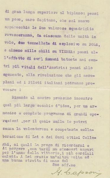 Dattiloscritto a inchiostro blu con firma autografa. Un bifolio intestato Ing. Gianni Caproni, via S. Gregorio, 28, Milano, 4 pagg. scritte. Busta conservata, senza francobollo. Dimensioni 125x200 mm.