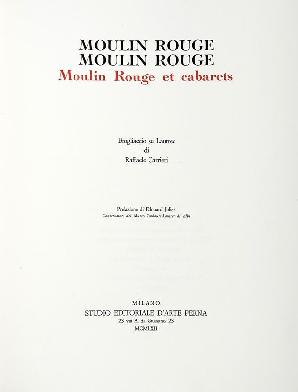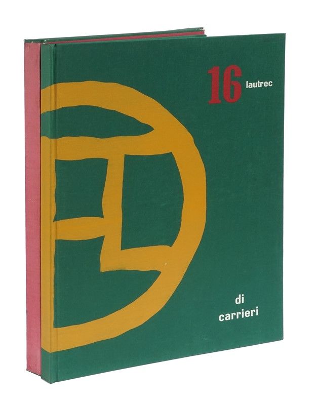 In-folio (mm 490x365), pagine 49, [1] con 16 bellissime tavole litografate a colori fuori testo di Toulouse-Lautrec, precedute da una carta descrittiva e da velina giapponese Unryu paper. Legatura editoriale in piena tela verde con monogramma dell'artista e titoli al piatto anteriore e plastica trasparente protettiva. Cofanetto in mezza tela con piatti in carta rossa con riprodotta una caricatura in nero. Quest'ultimo presenta minimi difetti. Ottimo stato di conservazione. Uno dei 999 in cifre arabe, su una tiratura complessiva di 1369 esemplari.