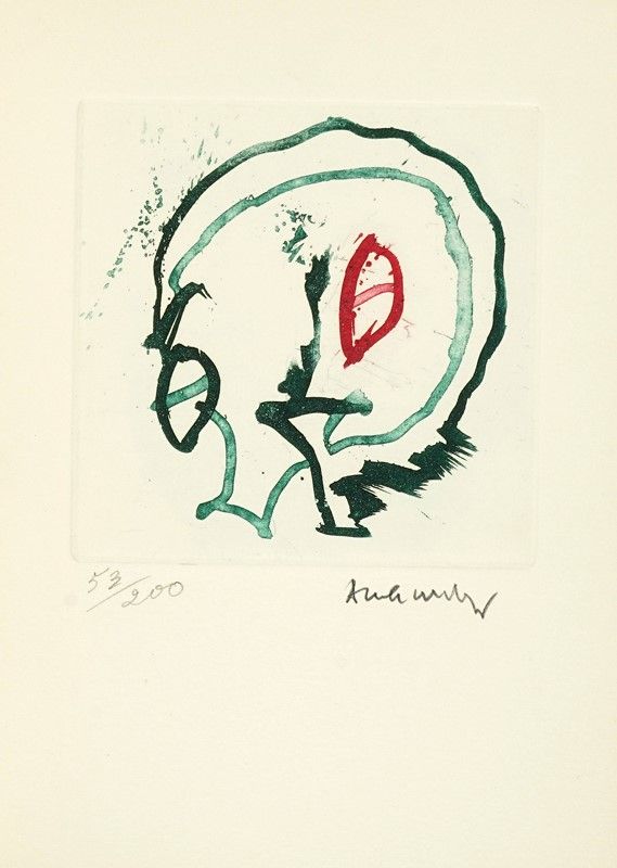 In-8° (mm 245x175). Testo in offset e 20 carte stampate fronte retro con le riproduzioni in fototipia delle opere di Pierre Alechinsky. Sciolta e protetta da velina, una bella acquaforte originale a colori dell'Artista, in 200 esemplari numerati e firmati a matita (mm 115x115. Foglio: mm 235x170). Brossura originale, con un'illustrazione al piatto anteriore colorata a mano da Henri Hus. Lieve ingiallimento alla brossura, altrimenti ottimo stato di conservazione. Tiratura in 500 esemplari.