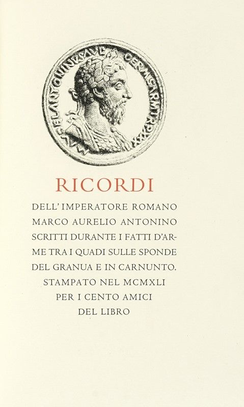 In-8° (mm 240x150). Pagine [10] (le prime due carte bianche), 220, [6], 2 carte bianche. Incisione in rame di Bruno Croatto sul frontespizio. Ottimo esemplare in barbe. Legatura in pieno marocchino rosso, con titolo impresso in oro sul dorso e taglio superiore dorato; custodia in cartone rivestita in carta marmorizzata. Uno dei 100 ad personam, su una tiratura complessiva di 120 esemplari su carta a tino Magnani. Presente un foglio ripiegato datato Giugno 1942 del Consiglio Direttivo dei Cento Amici del Libro.