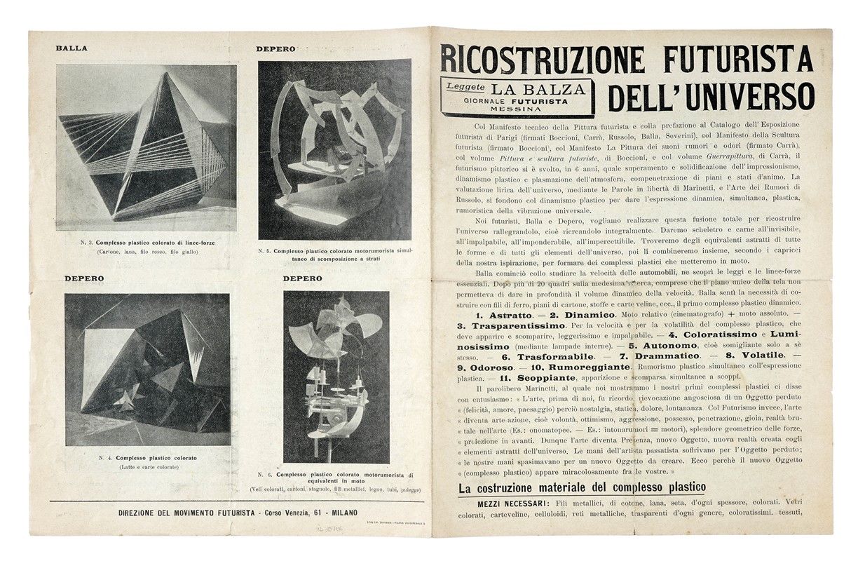 «Noi futuristi, Balla e Depero, vogliamo realizzare questa fusione totale per ricostruire l'universo rallegrandolo, cioč ricreandolo integralmente.», Milano: Direzione del movimento futurista, 11 marzo 1915.