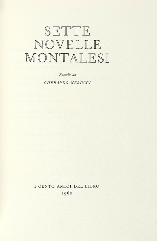 In-4° (mm 300x215). Pagine [4] bianche, 97, [3], [4] bianche. Con 16 acqueforti di Dario Cecchi di cui una a doppia pagina e una al piatto anteriore della brossura. Brossura editoriale illustrata, con titoli in nero al dorso; con velina protettiva e custodia editoriale in cartonato. Uno dei 100 esemplari ad personam numerati con cifre romane, su una tiratura complessiva a 116 copie stampate su carta a mano Magnani, con firma di Sanminiatelli al colophon.