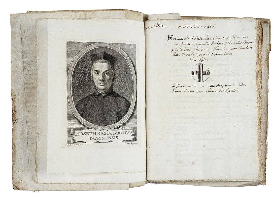 Manoscritto a inchiostro nero. 3 volumi. Pagine 341 (cui seguono 36 pagine di repertorio), 491 (cui seguono 13 pagine di repertorio), 329. Testo in italiano e latino. Nel primo tomo è presente l’acquaforte che raffigura Giuseppe Richa e che è presente anche nell’edizione. Legatura floscia in pergamena antica. Dimensioni: 300x200 mm.