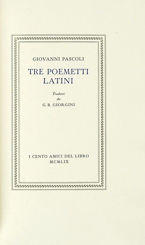 In-4° (mm 305x205). Pagine [4] bianche, 66, [4]. Con 10 acqueforti di Arnoldo Ciarrocchi. Esemplare ad personam su una tiratura di 120 copie stampate su carta a tino Magnani, con firma di Sanminiatelli al colophon. Brossura editoriale in carta Ingres rosa con titoli stampati in grigio al dorso e al piatto anteriore; velina protettiva e custodia in carta Ingres rosa. Minime macchioline, altrimenti ottima copia.