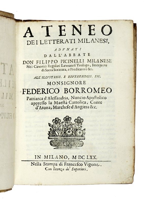 In-4° (mm 200x150). Pagine [28], 520, [20]. Fregio in legno al frontespizio; testatine, capilettera e finalini anch'essi xilografici. Mancanza reintegrata con carta forte all'occhietto e al figlio di guardia posteriore; fioriture e lievi macchie sparse, ma buona copia. Legatura coeva in piena pergamena, con titoli manoscritti al dorso. Bruniture al dorso e macchie ai piatti, ma complessivamente buona conservazione.
