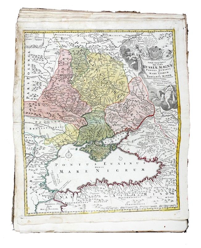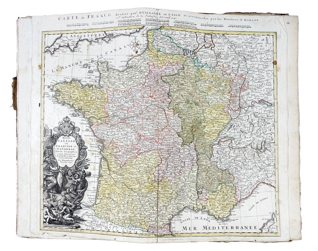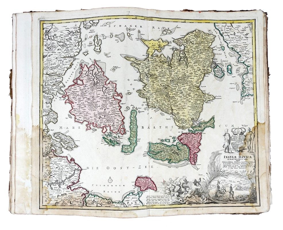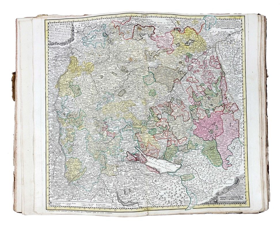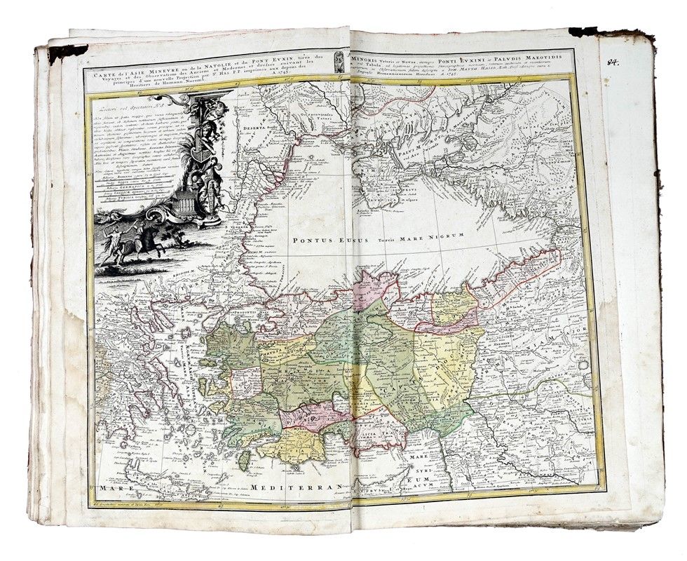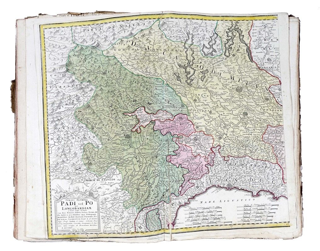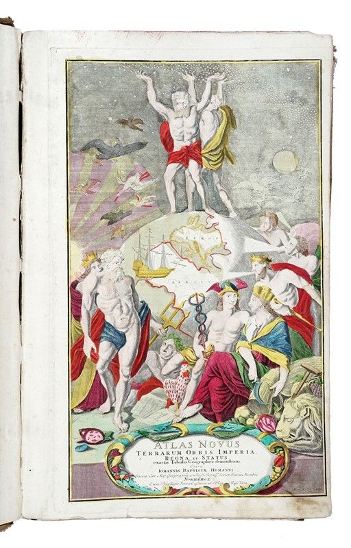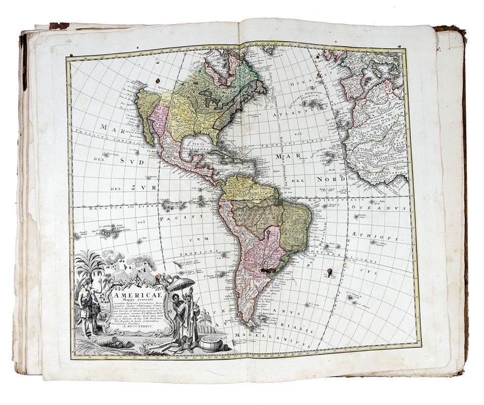 In folio massimo (mm 585x340). Contiene 1 frontespizio figurato, 1 frontespizio tipografico, 1 carta di Index in calcografia, 1 ritratto dell'Autore, pagine 40 e 98 [di 100] carte geografiche a doppia pagina. Esemplare con difetti: circa 20 carte risultano strappate in corrispondenza della piega del foglio, gorato il margine della seconda metà dei fascicoli, una macchia d'inchiostro nell'angolo superiore esterno di circa 10 carte. Assenti, secondo la numerazione manoscritta al verso di ogni carta, le n. 94 e 98 sull'America. Tavole in coloritura non coeva. Legatura in pieno cartonato rustico rivestito in tela. Tela strappata in più punti.