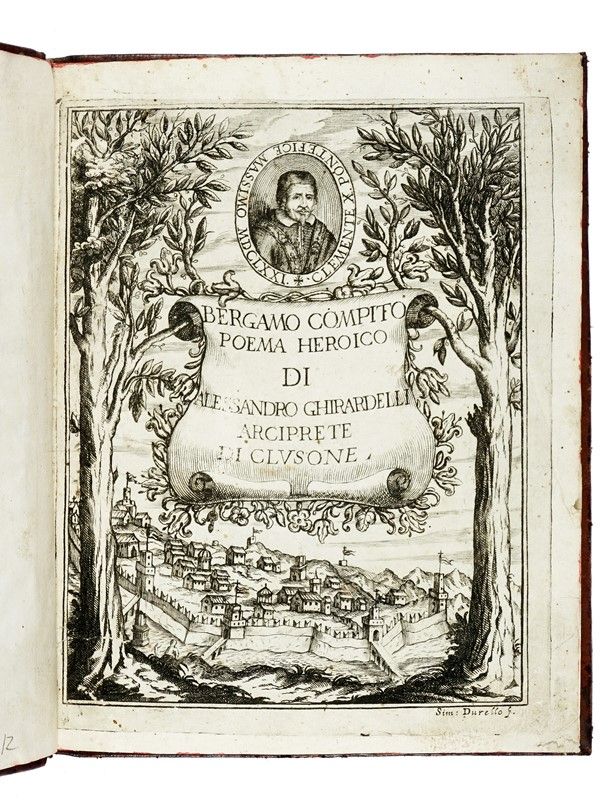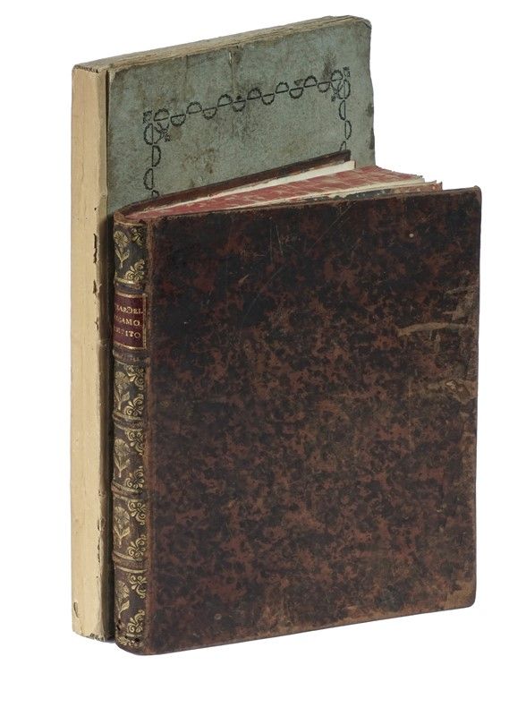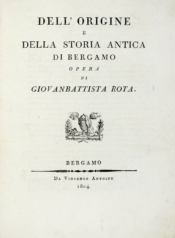 In-4° (mm 220x170). [8], 223, [4], 1 bianca con 1 antiporta figurata in principio e un ritratto dell'autore a carta +4v. Buona copia. Legatura coeva in piena pelle con titolo e decorazioni in oro ai comparti del dorso, tagli e sguardie marmorizzate. Mancanze sul piatto posteriore. SI AGGIUNGE: Rota Giovanni Battista, Dell'origine e della storia antica di Bergamo. Bergamo: da Vincenzo Antoine, 1894. In-4° (mm 300x210)