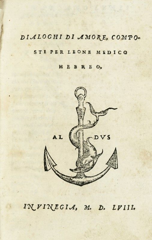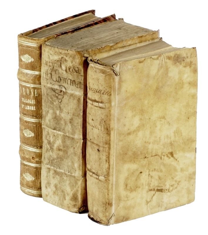 In-8° (mm 148x100). Carte [8] di [12], 398, [1]. Marca aldina ripetuta al frontespizio e in fine. Copia priva delle carte da a2 a a5, a6, a7 e a8 mal ripiegate ma presenti. Restauri marginali a poche carte, copia lievemente gorata. Legatura coeva in piena pergamena floscia con titolo manoscritto al dorso. SI AGGIUNGE: Abrabanel Isaac ben Judah, Dialoghi di amore composti per Leone medico hebreo. In Vinegia: [marca aldina], 1558. (Al colophon:) In Venetia: per Isepo Guglielmo Vicentino, 1558. In-8° (mm 145x95). Carte 228. Marca aldina ripetuta al frontespizio e infine. Frontespizio parzialmente controfondato. Parte delle carte brunita, ma copia completa. Legatura ottocentesca in mezza pelle con piatti in cartonato e titolo in oro al dorso. SI AGGIUNGE: Ruscelli Girolamo, Il rimario [...] in questa ultima impressione ampliato. Venetia: appresso Antonio Tivani, 1698. 1 volume in-8° (mm 141x90).