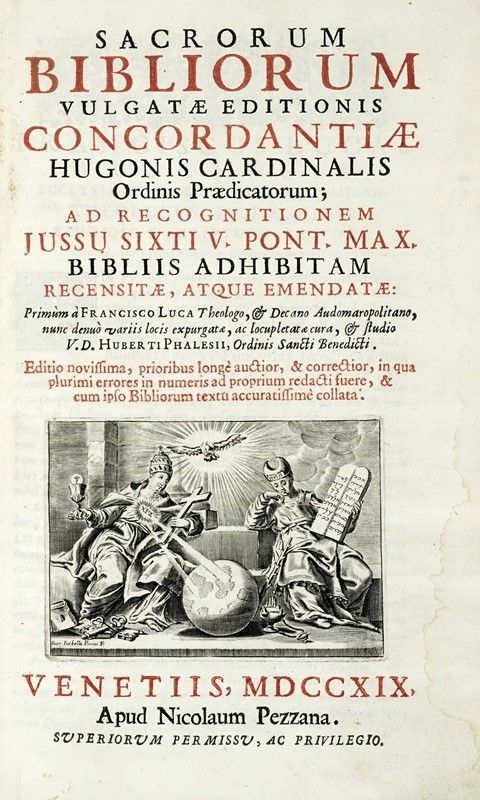 2 volumi in folio (mm 355x235). Ciascun volume con frontespizio impresso a due colori e decorato da ampia vignetta calcografica. Esemplare in barbe. Legatura coeva in pieno cartonato rustico con titoli manoscritti al dorso. SI AGGIUNGONO: Tommaso d'Aquino (santo), Additiones ad Tertiam Partem... Venetiis: apud Iuntas, 1588. Sacrorum bibliorum vulgatae editionis concordantiae... Venetiis: apud Nicolaum Pezzana, 1719.