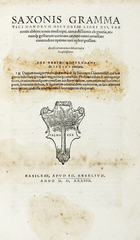 In folio (mm 302x200). Carte [16], 189, [1]. Fregio xilografico ripetuto in principio e fine, alcune iniziali in legno. Antica nota di possesso manoscritta lavata al frontespizio, con lieve ossidazione della carta, lievissimo foxing in poche carte, per il resto splendida copia, marginosa e fresca. Legatura in piena pergamena floscia con titolo manoscritto al dorso. Mancanze in corrispondenza delle cuffie, sguardie rinnovate.