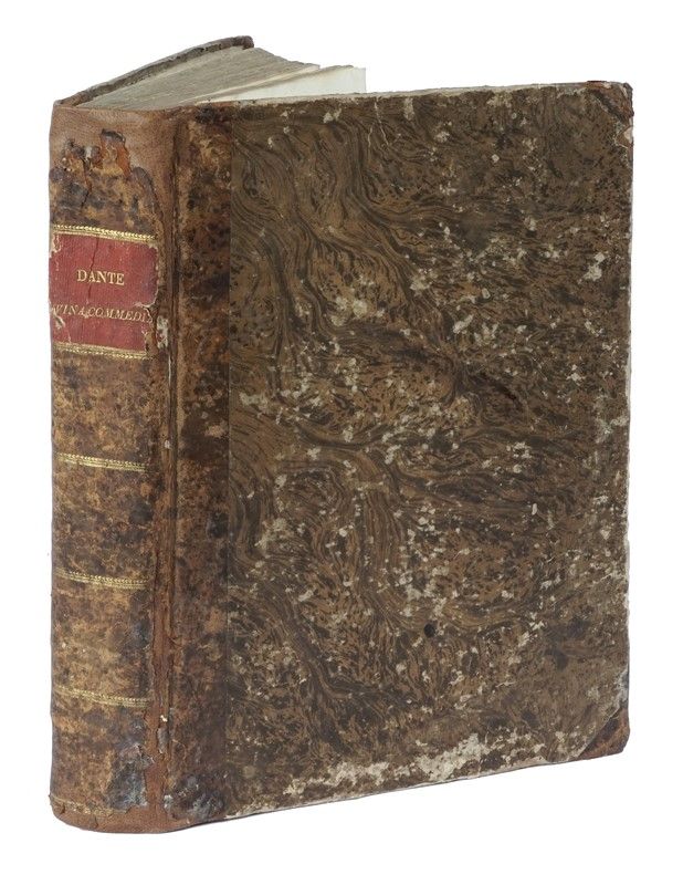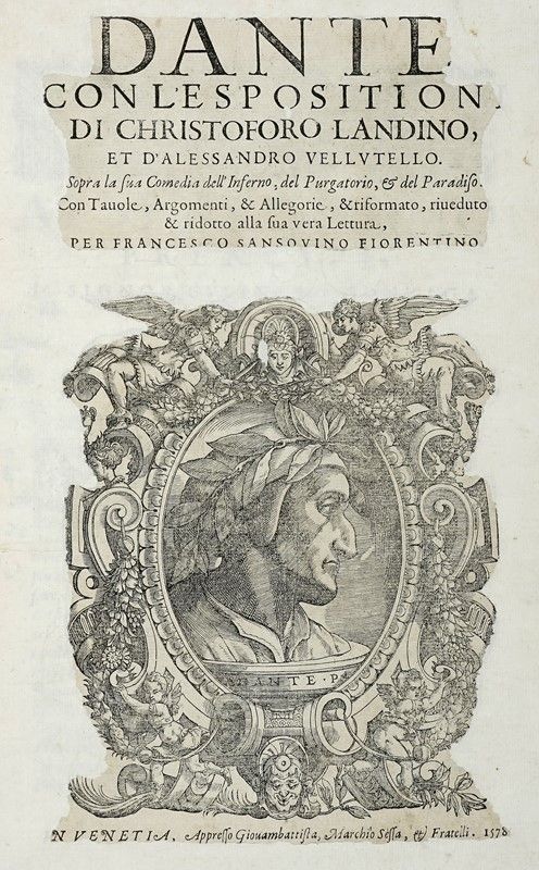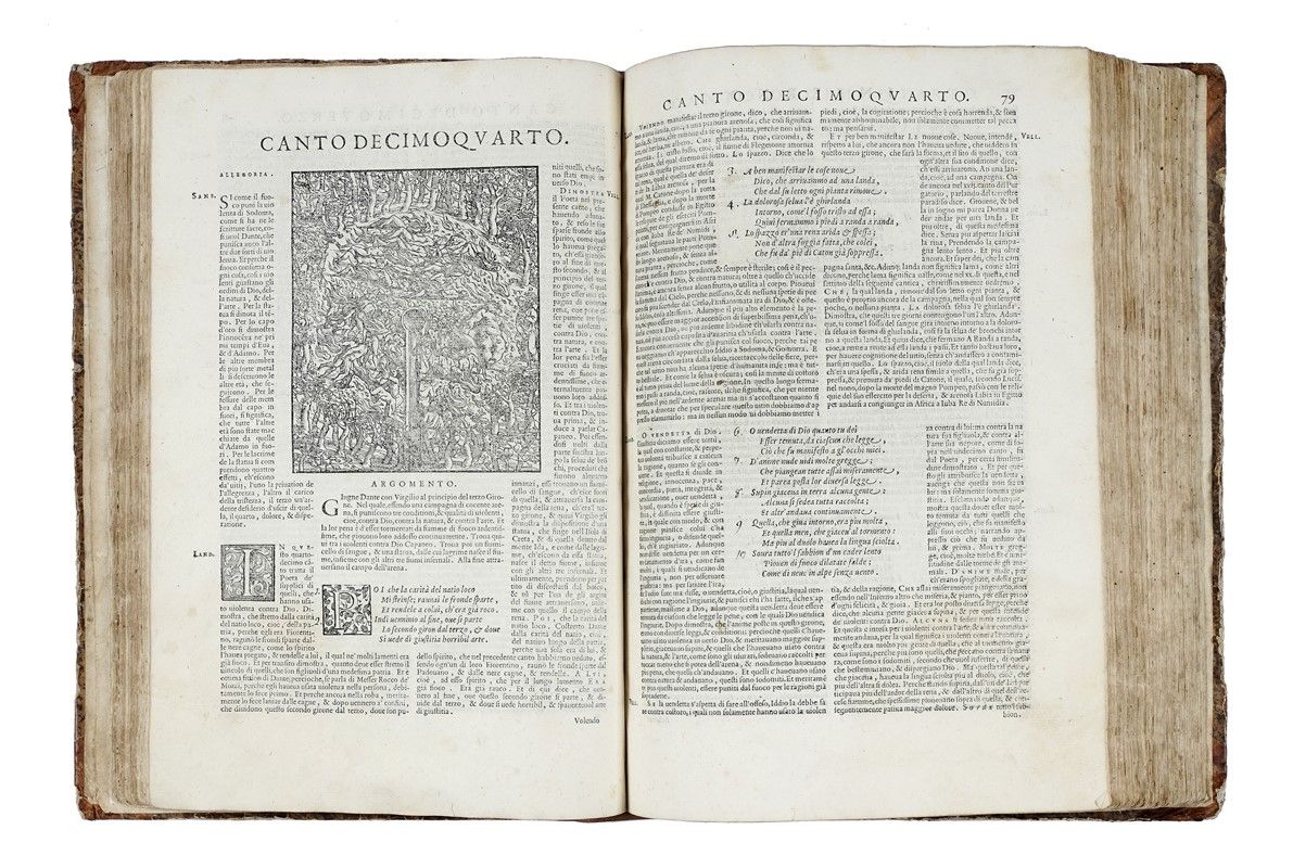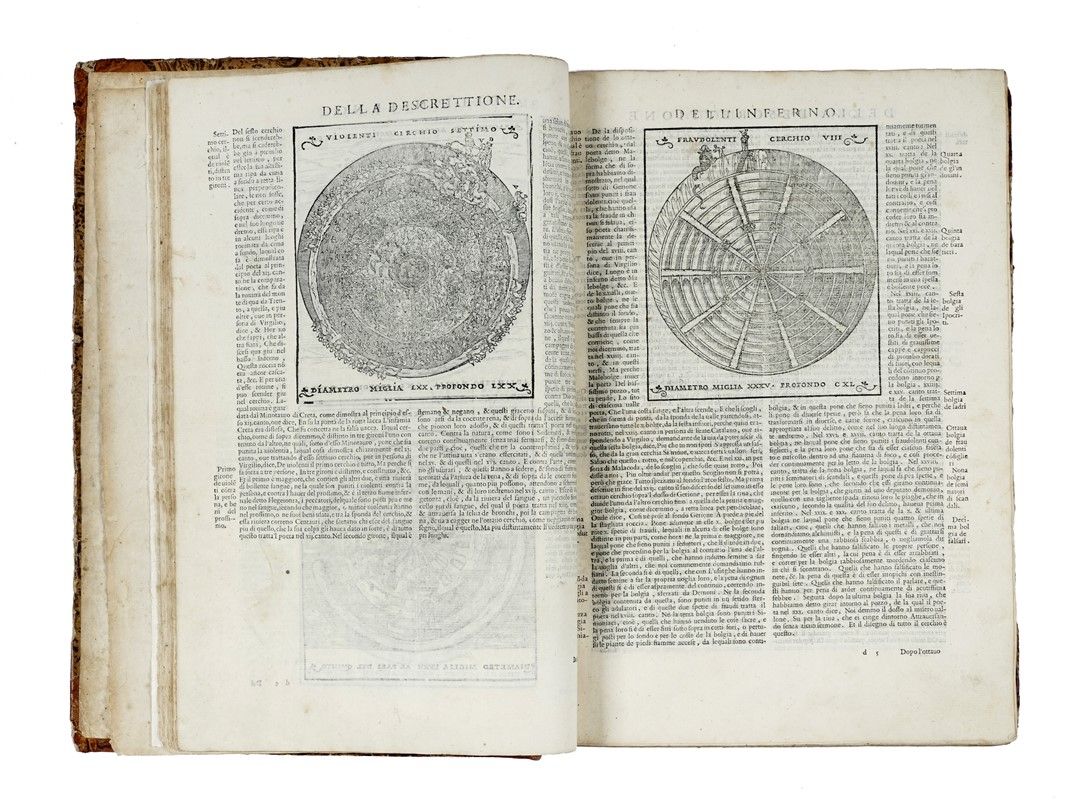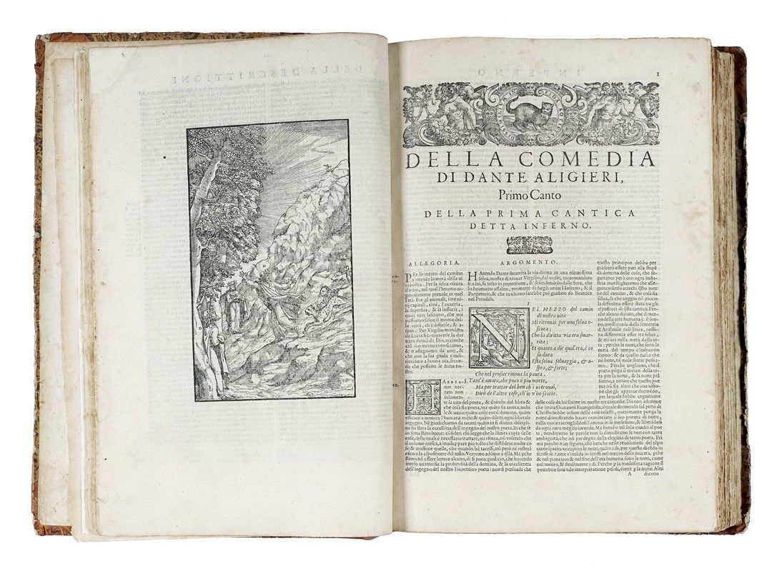 In folio (mm 315x215). Carte [28], 163, [4], 164-392. Ritratto di Dante entro bordura architettonica al frontespizio e molte illustrazioni nel testo, 10 nella Descrittione de lo Inferno del Vellutello e le altre in principio dei canti, testatine, capilettera e fregi nel testo, il tutto xilografico. Frontespizio rimontato su carta moderna, con riapplicati i titoli e il ritratto di Dante in xilografia. Strappo richiuso che non tocca il testo a carta Q6, parte dei fascicoli lievemente gorata in corrispondenza dell'angolo inferiore esterno, occasionali bruniture, pecette di rinforzo lungo i margini dell'ultima carta. Legatura ottocentesca in mezza pelle con piatti in carta marmorizzata e titoli in oro su tassello al dorso. Mancanze ai piatti e lungo le cerniere.