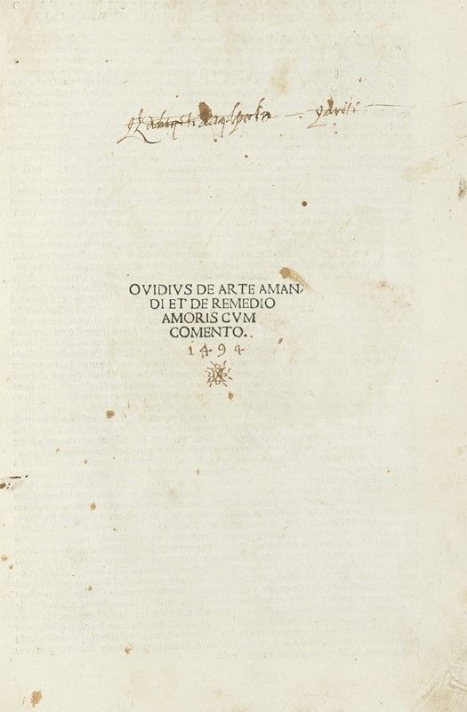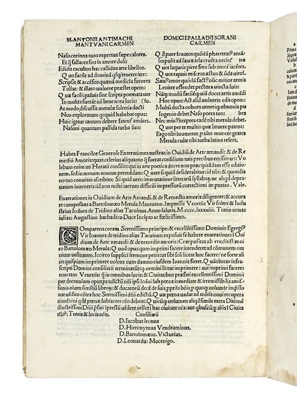 In folio (mm 290x200). Carte LIII, [1]. Collazione: a-g6 A6 B-C4. Iniziali xilografiche, marca tipografica in fine. Copia con piccoli e marginali lavori di tarlo che non ledono il testo e una leggera gora d'acqua nel margine inferiore delle carte, più visibile in alcune carte di volume. Macchia alle carte g5, g6 e al fascicolo A. Legatura in piena pergamena floscia con titolo manoscritto al dorso. Mancanza in corrispondenza della cuffia inferiore. Nota manoscritta alla prima carta.