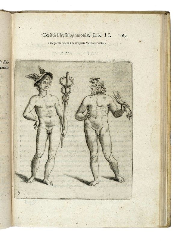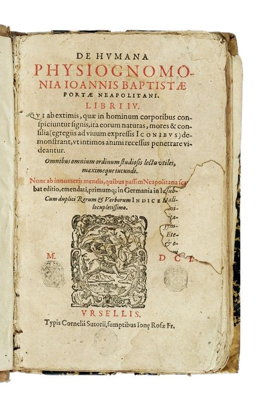 In-8° (mm 189x115). Pagine [16], 534, [58]. Frontespizio in rosso e nero con marca xilografica, numerose illustrazioni in legno nel testo. Carte intensamente brunite, con foxing e gore d'acqua. Frontespizio staccato ma presente, una bruciatura al margine esterno con parziale perdita di testo. Strappi con perdite alla carta 2A6. Legatura in mezza pergamena con punte, piatti in carta marmorizzata e titoli manoscritti al dorso. Fori di tarlo lungo dorso e cerniere. Mancanze alle unghiature. Timbri illeggibili di precedente collezione al frontespizio e alla carta )(6r. Esemplare da studio. SI AGGIUNGE: Id., Coelestis physiognomoniae libri sex... Neapoli: ex typographia Io. Baptistae Subtilis, 1603. In-4° (mm 257x181). Pagine [8], 191 [i.e. 187], [1]. Omesse nella numerazione le pagine 38-41. Assenti le carte G3, H2, K3 e X2-3. Stemma calcografico al frontespizio, testatine, fregi xilografici e belle illustrazioni in rame nel testo. Sporadiche fioriture alle carte, restauro con pecetta di carta al margine inferiore di carta a4. Piccoli lavori di tarlo ai margini interni del primo fascicolo. Annotazione manoscritta al contropiatto anteriore. Legatura in piena pergamena con titoli in oro su tassello in pelle al dorso. Timbro di precedente collezione al frontespizio.