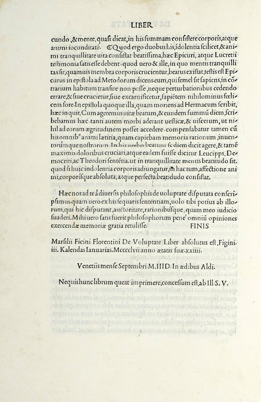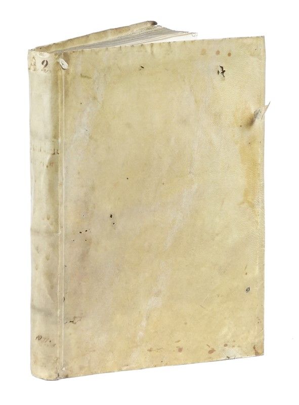 Super-Chancery folio (mm 307x198). Carte [138] (di 186). Segnatura: a-i?, K?, L-M?, N-Z? (- N-S8), &¹? (&10 bianca). Testo in caratteri romani su 37 righe più il titolo; spazi per capilettera con letterine-guida, 37 righe più il titolo. Copia postillata, con la carta a2 erroneamente nominata a3. Esemplare scompleto dei fascicoli N8, O8, P8, Q8, R8, S8. Gore marginali ad alcune carte e fioriture sparse. Legatura in pergamena antica floscia muta con lacerti di legacci. Ex-libris della famiglia Peruzzi al contropiatto anteriore.