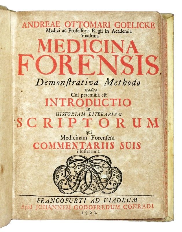 In-4° (mm 195x145). Pagine [20], 352. PRECEDUTO DA: Goelicke Andreas Ottomar, Medicina forensis demosnstrativa methodo tradita cui praemissa est... Francofurti ad Viadrum: apud Johannem Godofredum Conradi, 1723. 2 parti in 1 volume. Pagine [24], 150 [i.e. 148]; [2], 69, 1 bianca, 53-112. Prima parte del volume fortemente brunita, leggere fioriture marginali nella seconda parte. Legatura successiva in piena pergamena rigida con titolo in oro su tassello al dorso, tagli spruzzati.