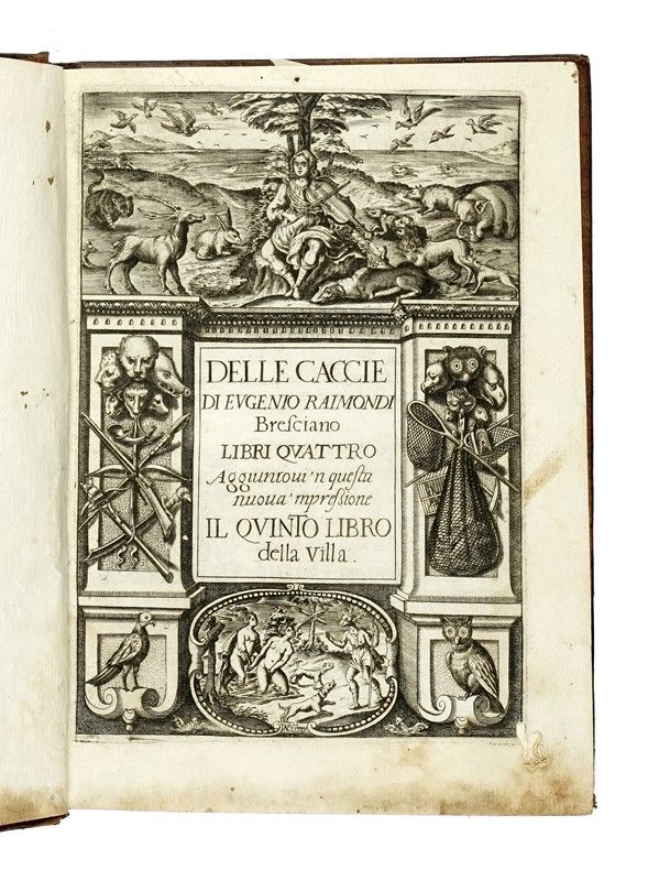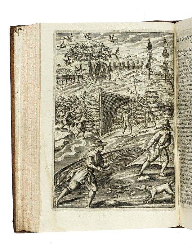In-4° (mm 200x135). Pagine [56], 635, [1]. Bel frontespizio calcografico e 21 incisioni a piena pagina con scene di caccia e pesca. Lavoro di tarlo nel margine inferiore esterno delle prime carte, con perdita di piccola porzione d'inciso del frontespizio figurato, altro tarlo nel margine superiore delle prime 30 carte, talvolta toccante il testo. Copia gorata marginalmente nei primi fascicoli di testo, alcune carte brunite. Alcuni forellini di tarlo in fine. Legatura in piena pelle con titoli impressi in oro su tassello al dorso e tagli spruzzati.
