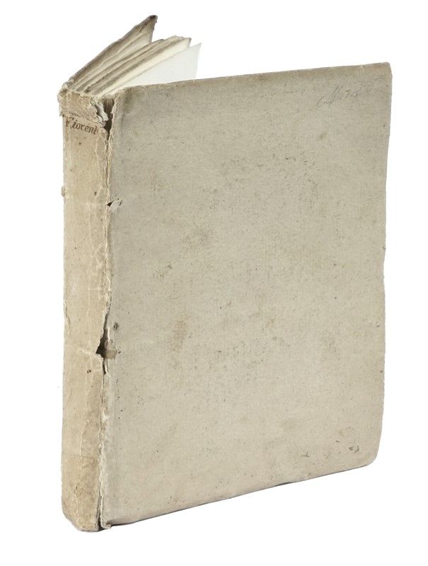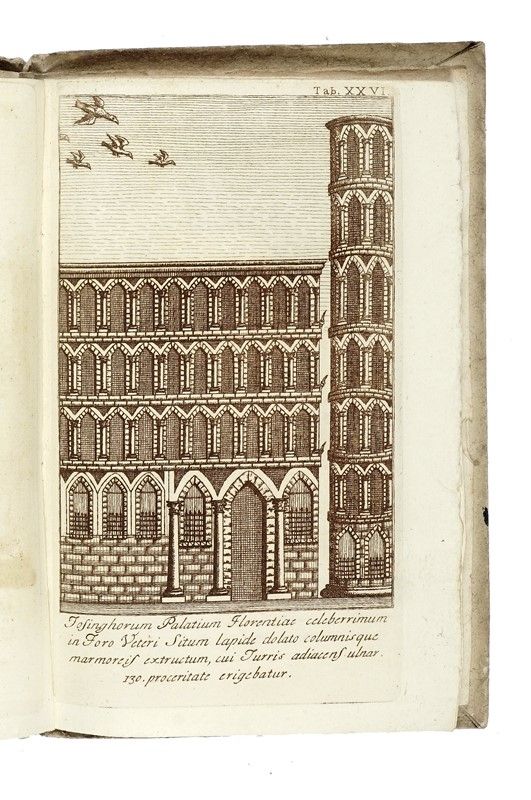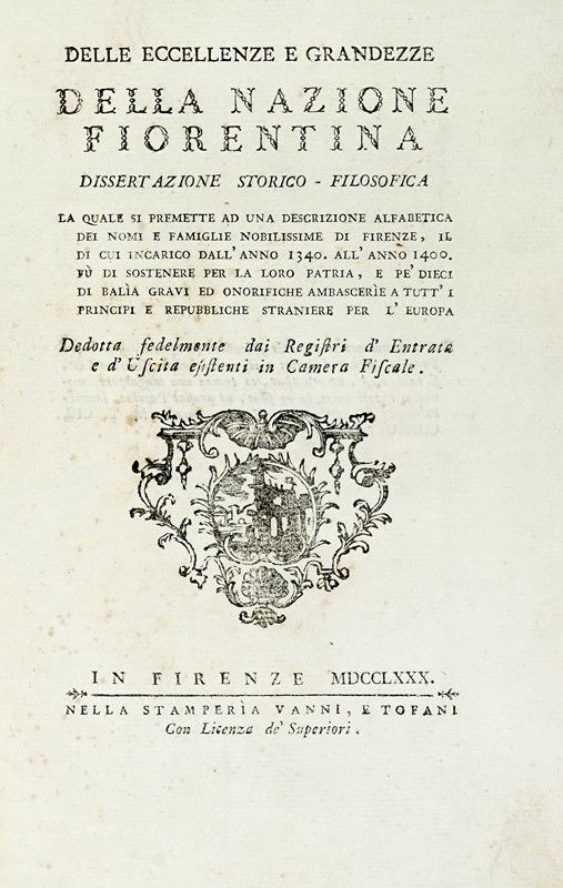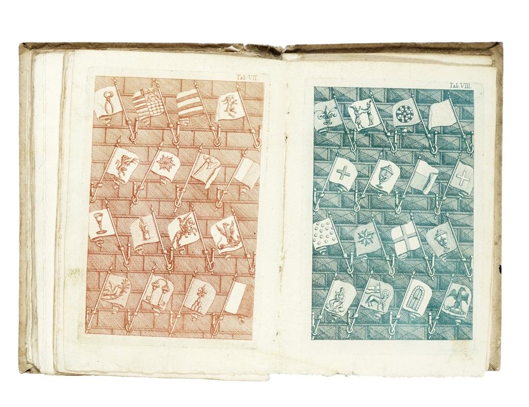 In-8° (mm 216x145). Pagine [2], CVII, [1], 126 [i.e. 116] con, fuori testo, 1 blasone della famiglia Cerchi inciso in inchiostro blu, 1 carta di Dedica calcografica e 16 tavole incise in rame a piena pagina tirate in rosso, verde, blu e marrone raffiguranti stemmi, gonfaloni e carri militari e sacri. Pagine 105-116 erroneamente numerate 115-126. Esemplare parzialmente intonso e in barbe, fascicoli allentati ma ben conservato. Cartonato coevo con titoli manoscritti al dorso, allentato internamente, con piccole lacune alle cerniere e alle cuffie.