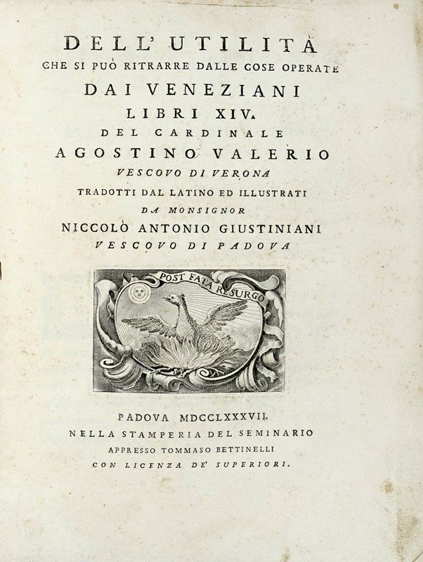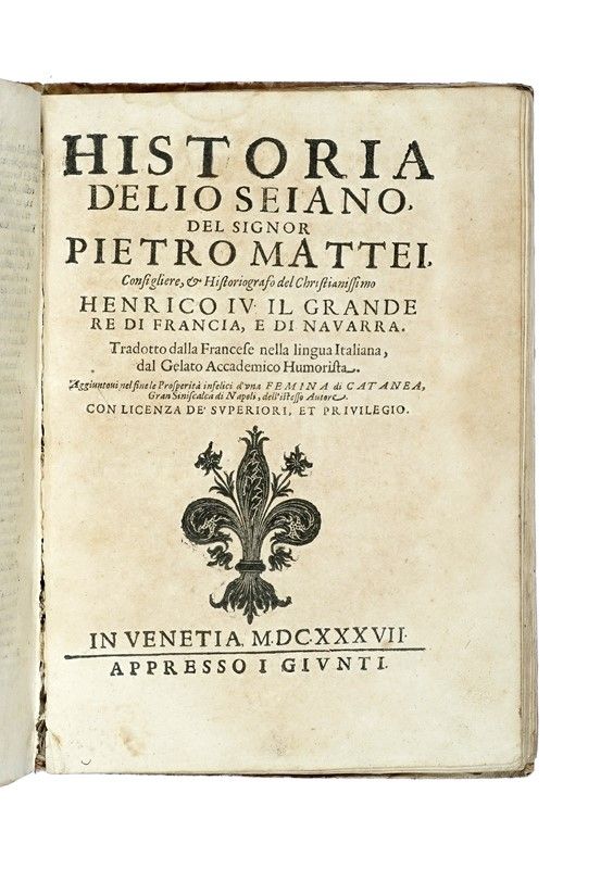 In-4° (289x215). Pagine XVI, 421, [3]. Marca tipografica in rame al frontespizio con il motto "Post fata resurgo". Testatine e finalini in legno nel testo. Ultimo fascicolo allentato, una gora d'acqua alle carte finali. Margini esterni di queste uiltime rovinati. Legatura in cartonato coevo con etichetta in carta al dorso. Mancanze al dorso e alle unghiature. Note di mano antica nel testo e alla prima e all'ultima carta. SI AGGIUNGE: Matthieu Pierre, Della historia delle guerre intestine e delle rivolutioni di Francia... In Venetia: presso il Barezzi, 1638. In-4° (mm 225x160). Pagine [36], 666, [2]. LEGATO CON: Id., Historia verace delle guerre seguite fra le due gran corone di Francia e di Spagna... In Venetia: presso il Barezzi, 1638. Pagine [16], 76, 28, 77, [3]. LEGATO CON: Id., Historia d'Elio Seiano... In Venetia: appresso i Giunti, 1637. Pagine [8], 99, [1]. Testatine, capilettera e finalini in legno nel testo. Bruniture concentrate ad alcune carte, fioriture sparse e gore d'acqua agli ultimi fascicoli. Legatura in piena pergamena molle con titoli manoscritti al dorso. Macchie ai piatti e mancanze al dorso. Nota di possesso di mano antica al foglio di guardia anteriore.