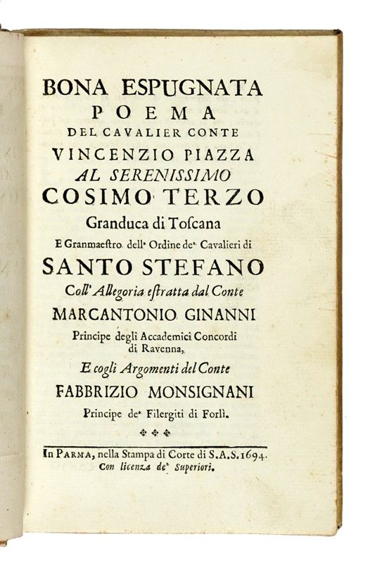 In-8° (mm 145x95). Carte [1], 2-3, [4-15], 192 (i.e. 194). Esemplare rifilato nel margine superiore, con bruniture. Legatura settecentesca in piena pelle bazzana con impressioni in oro. Mancante la cuffia superiore. Buona copia. SI AGGIUNGE: Piazza Vincenzo, Bona Espugnata. Parma: nella stampa di Corte, 1694. In-8° (mm 175x115). Pagine XVI, 303, 1 bianca con 1 antiporta, 1 ritratto dell'Autore e 12 tavole incise in rame fuori testo. Arrossature marginali. Legatura coeva in piena pergamena con titolo su tassello al dorso. Ottimo stato di conservazione. SI AGGIUNGE: Muzio Girolamo, Il Duello [...]con le risposte cavalleresche... In Venetia: appresso la Compagnia de gli Uniti, 1585.