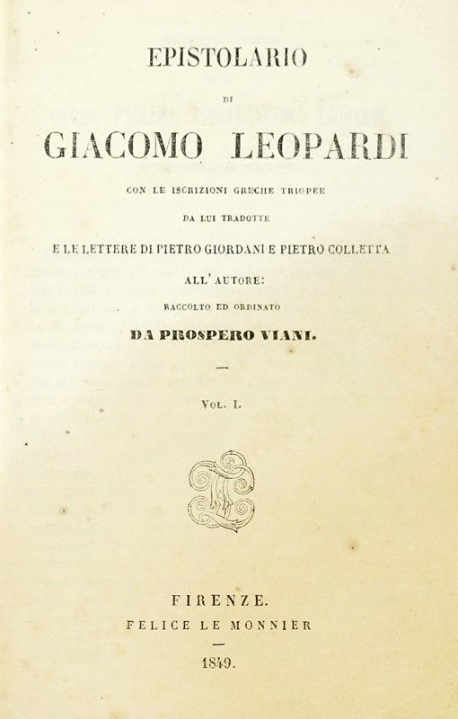 2 volumi in-16° (mm 176x110). Pagine XVI, 463, 1 bianca; 403, [5]. Marca editoriale al frontespizio di entrambi i volumi. Gora nel margine inferiore delle carte, più visibile nella prima metà dei fascicoli al primo volume, macchie marginali nel secondo. Legatura coeva in mezza pelle con piatti in percallina verde e titoli in oro al dorso. Tracce d'uso a piatti e dorso. Ex-libris di precedente proprietario applicato al contropiatto anteriore di ciascun volume.