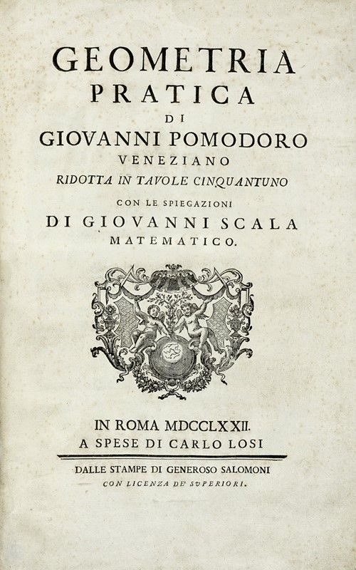 In-folio (mm 410x265). Pagine [4], 42, [2]. Con 1 frontespizio calcografico e 51 belle tavole calcografiche numerate I -XLIV e I- VII; il tutto rilegato in fine, fuori testo. Marca al frontespizio tipografico e iniziali in legno. Rare macchie e forellini di tarlo sparsi; una lieve mancanza marginale all'ultima tavola, ma nel complesso buona copia. Legatura in mezza pergamena, con piatti in carta marmorizzata e sguardie rinnovate. Lievi mancanze ai piatti.