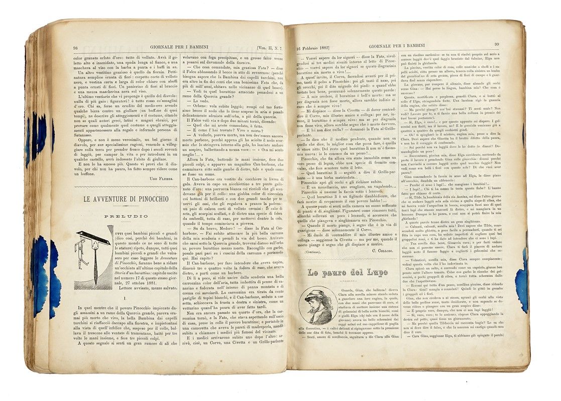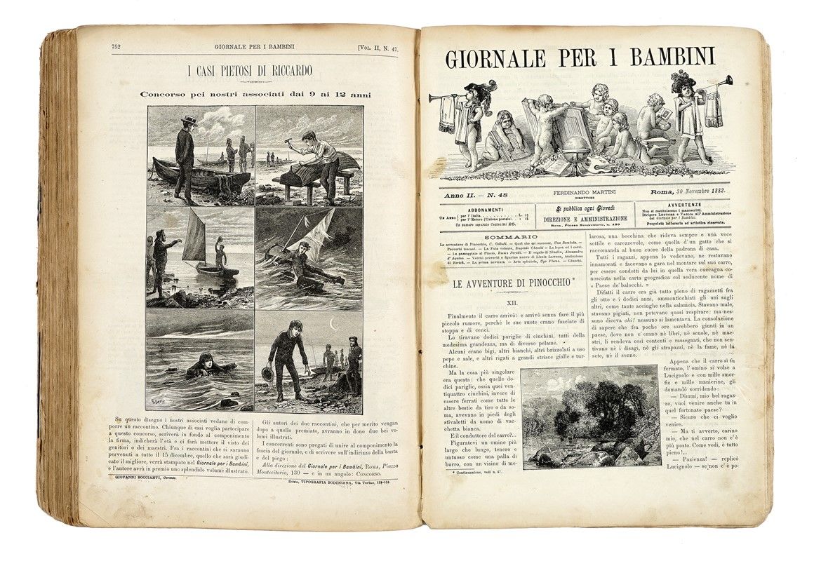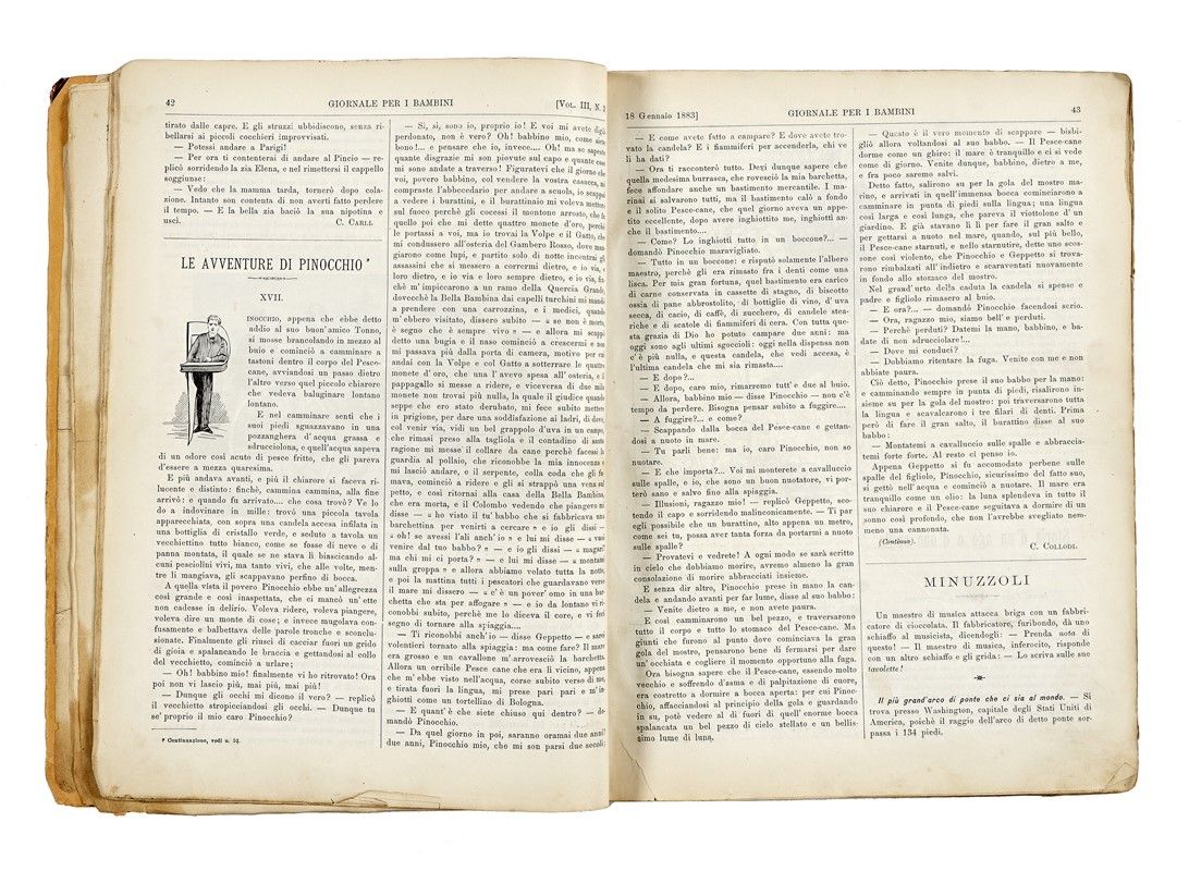 3 annate in 3 volumi in-4° (mm 290x205). Dal n. 1 dell'Anno I (7 luglio 1881) al n. 52 dell'Anno III (27 dicembre 1883). 130 fascicoli (rispettivamente 26, 52, 52) di circa 14-16 pagine ciascuno, con 2 tavole cromolitografie, a piena pagina fuori testo, nel primo volume. Moltissime illustrazioni, alcune anche a piena pagina. Frontespizio rimontato, con mancanze marginali. Al primo volume, vistose mancanze, rinforzi e strappi maldestramente restaurati con nastro adesivo principalmente ai nn. 1, 2, 5, 14, 19, 21, 23, 24 e 26. Al secondo le pagine 7-10 sono parzialmente staccate e riparate con il nastro adesivo trasparente; mentre molte pagine, principalmente ai nn. 2,3, 5, 9 10, 11, 22, 52 presentano strappi, rinforzi o mancanze; una macchia di inchiostro marginale ai primi fascicoli e una gora al margina superiore dell'ultima parte del volume. Strappi, mancanze e restauri con nastro adesivo a molte pagine, maggiormente concentrati ai nn. 1, 5, 7, 18, 19, 25, 27, 28, 33, 36, 44; sciolte, ma presenti, le pagine 469-477 che sono comunque presenti. Bruniture e altre mende a tutti e tre i volumi. Mancanti le pagine 15-16 al primo volume e le pagine 1-6, 143-146, 163-164, 173-174, 379-380, 785-786 e 817-818 al secondo. Legatura coeva in piena tela, con numerosi difetti, abrasioni e una grave mancanza ai piatti del terzo volume e alla cerniera del secondo.