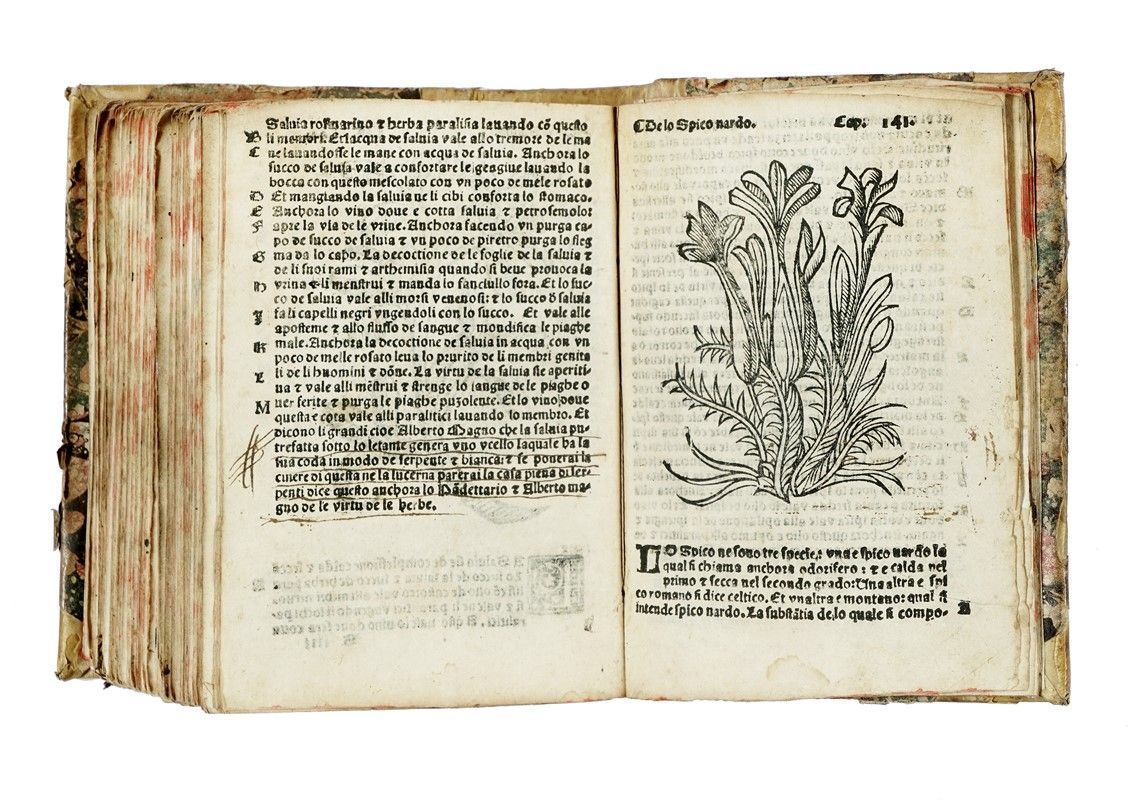 In-8° (mm 151x106). Carte [6], 151 [i. e. 148], [20] di [23]. Con oltre 100 illustrazioni xilografiche di piante a tre/quarti nel testo, 1 grande legno raffigurante i santi Cosma e Damiano al frontespizio con titoli impressi in rosso e nero con, 1 xilografia a piena pagina con l'Annunciazione a carta AA6v. Copia scompleta di 6 carte (E4, E5, F1, e le ultime 3 in fine), rifilata e con fioriture diffuse e macchie. PRECEDUTO DA: Dioscorides Pedanius, [Della materia medicinale]. (Al colophon:) Stampato in Fiorenza: appresso Bernardo di Giunti, del mese di Genaio 1546. Carte 306 [i.e. 305]. Marca xilografica sul frontespizio. Copia priva delle prime due carte e della carta A8, con numerosi errori di numerazione. Gore marginali, arrossature e tracce d'uso a gran parte delle pagine. Legatura successiva in mezza pergamena con punte e piatti in carta marmorizzata. Titolo manoscritto al dorso. Il Dioscoride presenta postille di mano antica nel testo.